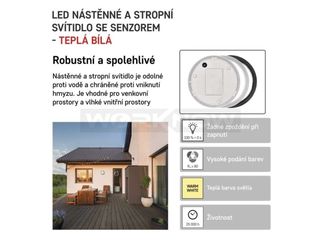 Můžete jej mít v celkem osmi variantách dle barvy, tvaru, stupně krytí, funkce, nebo barvy světla. Přisazené svítidlo má klasický kruhový tvar a uvnitř ukrývá moderní, velmi úsporné a trvanlivé LED diody s vysokým výkonem. Životnost svítidla je predikována na 25 000 hodin. Během nich vám bude krycí mléčný difuzor posílat světlo rovnoměrně a příjemně v širokém úhlu 120°. Výhodou oblíbeného svítidla je vysoký stupeň krytí. Svítidlo je tak vhodné do prostor s vysokou vlhkostí. Model je také vybaven chytrým PIR čidlem pohybu, který svítidlo aktivuje jen, když je třeba.