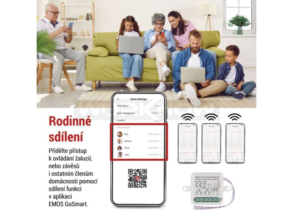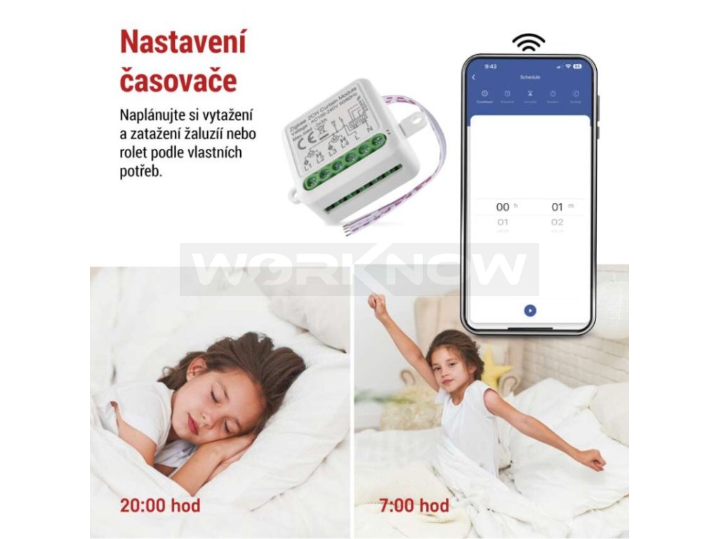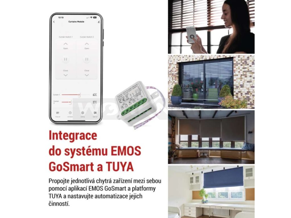Chytrý modul lze propojit s dalšími zařízeními ve vaší domácnosti (hodiny, světla, čidla dveří, oken, topení). Po spárování s mobilní aplikací EMOS GoSmart můžete automatizovat, vytvářet scénáře a plánovat časy pro jednotlivé spotřebiče. Například si naplánujte probuzení vytažením žaluzíí, nebo automatické zatmění oken v předem naplánovaném čase v době vaší nepřítomnosti. Vytvořte si chytrou domácnost, která se přizpůsobí vašim potřebám.