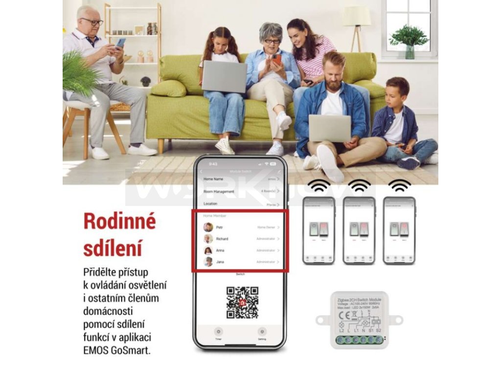 - Další funkce: tvorba scén, seskupování zařízení, časovač, rodinné sdílení