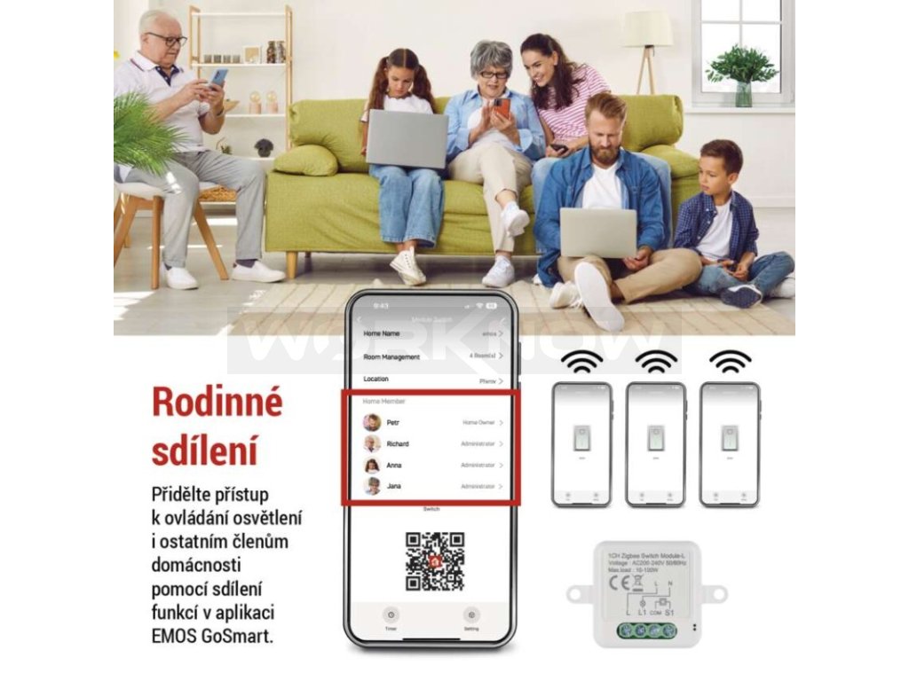 - Další funkce: tvorba scén, seskupování zařízení, časovač, rodinné sdílení