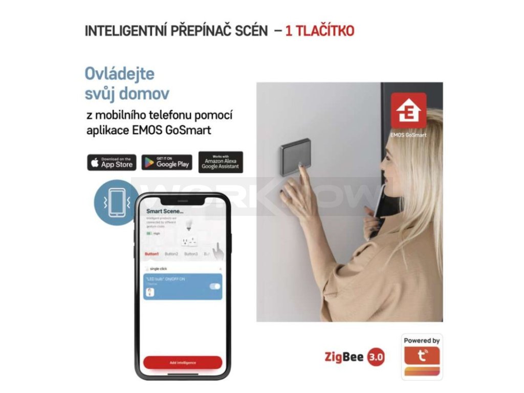 Ovladač scén IP-2001ZB propojíte s ostatními zařízeními chytré domácnosti pomocí ZigBee brány připojené k vaší domácí WIFI síti. Pomocí mobilní aplikace EMOS GoSmart pak nastavíte jednotlivé scény.