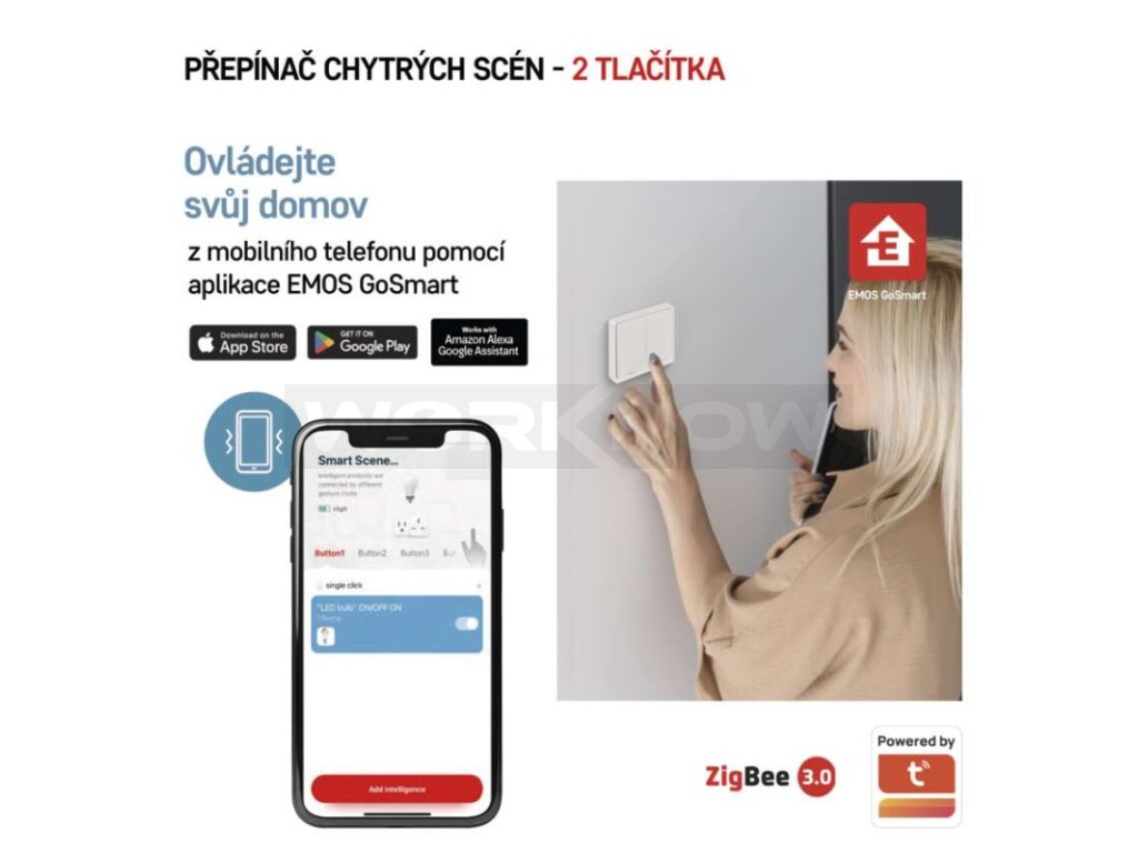 Ovladač scén IP-2002ZW propojíte s ostatními zařízeními chytré domácnosti pomocí ZigBee brány připojené k vaší domácí WIFI síti. Pomocí mobilní aplikace EMOS GoSmart pak nastavíte jednotlivé scény.