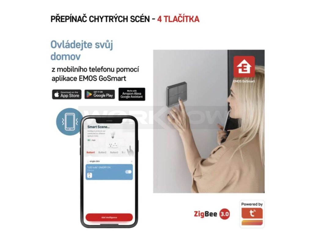 Ovladač scén IP-2004ZB propojíte s ostatními zařízeními chytré domácnosti pomocí ZigBee brány připojené k vaší domácí WIFI síti. Pomocí mobilní aplikace EMOS GoSmart pak nastavíte jednotlivé scény.