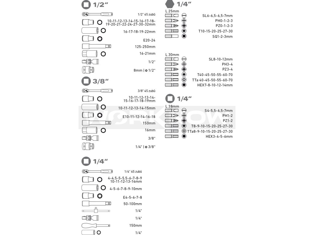 Hroty: 1/4": (-)6-6,5-6,5-7mm, PH0-1-2-3, PZ0-1-2-3, SQ1-2-3mm, T10-15-20-25-27-30, 8mm: (-)8-10-12mm, PH3-4, PZ3-4 HEX8-10-12-14, T40-