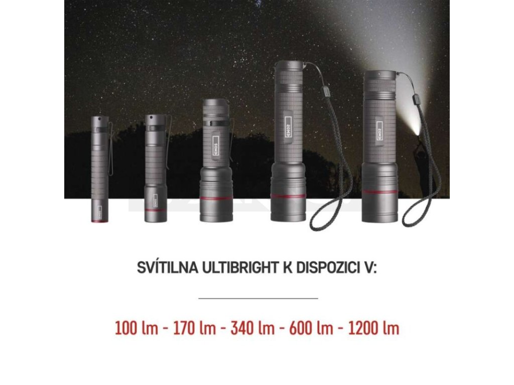 Kompaktní svítilna Ultibright 90 je praktickým doplňkem pro každou činnost, při které si potřebujete pohotově a spolehlivě posvítit. O dostatečný dosvit až 280 metrů a světelný tok 1 200 lm se stará kvalitní LED chip CREE XML2 U3.