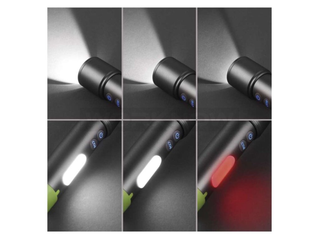 režimy svícení: SMD LED 100 %, SMD LED 30 %, SMD LED blikání, SMD LED SOS, COB LED červené svícení, COB LED blikání, COB LED 30 %, COB LED 100 %