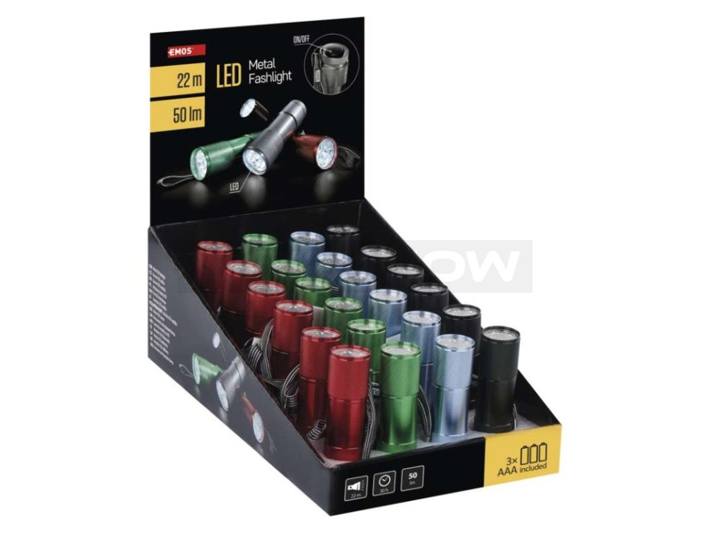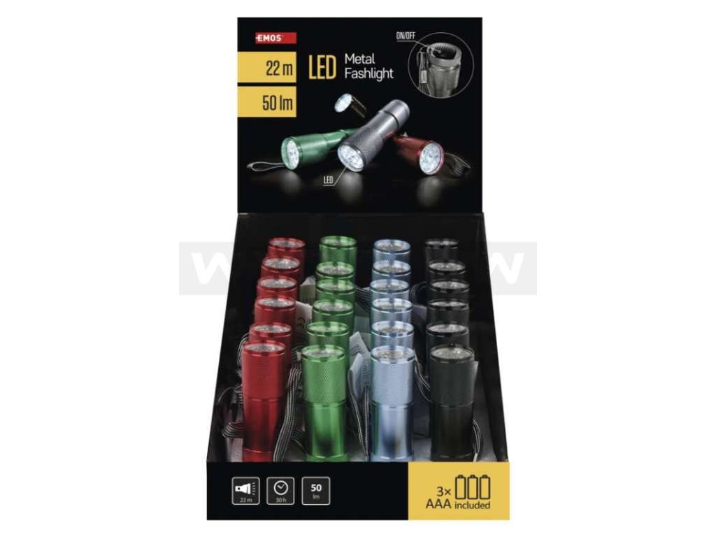 LED ruční kovová svítilna P3848A, 50 lm, 3× AAA, 24 ks, display box P3848A