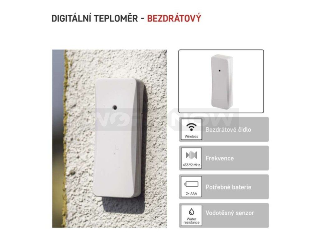 Bezdrátový teploměr, který měří vnitřní a venkovní teplotu. K teploměru se připojuje jedno bezdrátové čidlo s dosahem až 80 m.