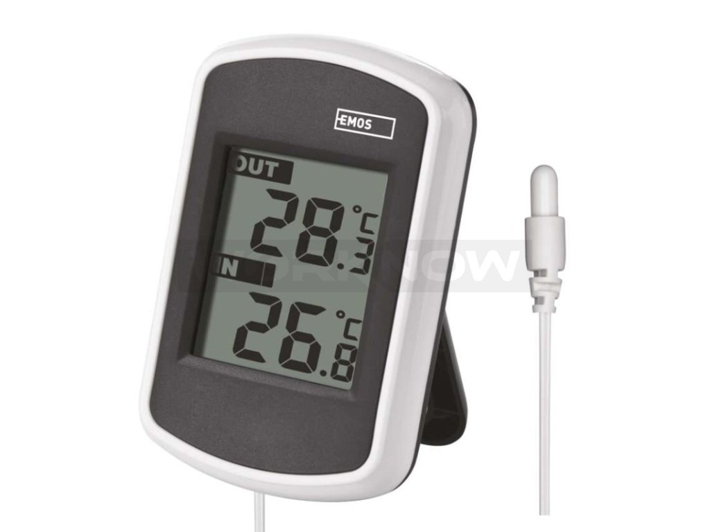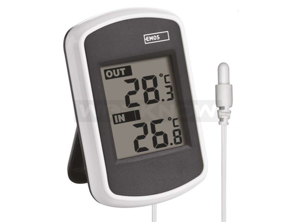 Drátový teploměr se zobrazením venkovní a vnitřní teploty. Teploměr má drátovou sondu v délce 2 m.