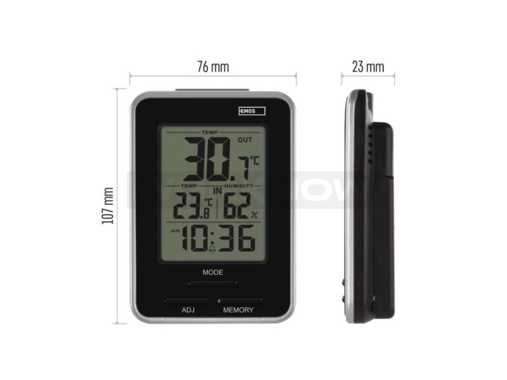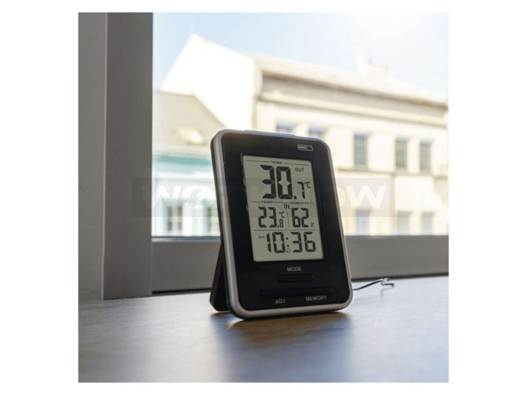 Měří vnitřní a venkovní teplotu a vlhkost.