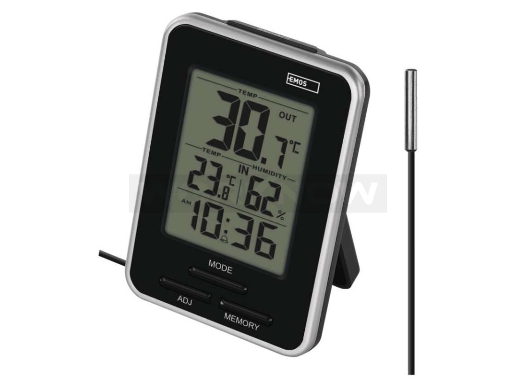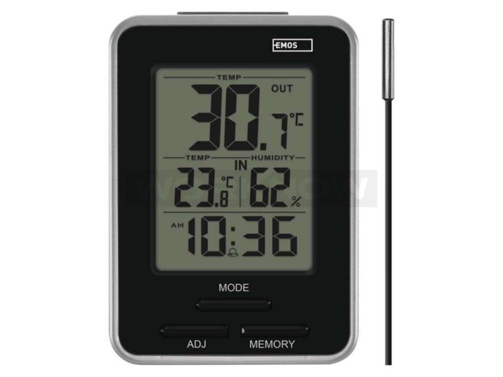 Drátový teploměr se zobrazením venkovní teploty a vnitřní teploty a vlhkosti. Teploměr má drátovou sondu v délce 2,9 m.
