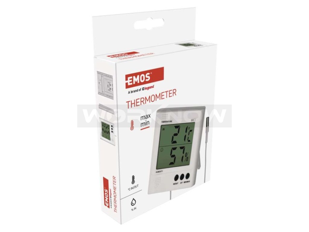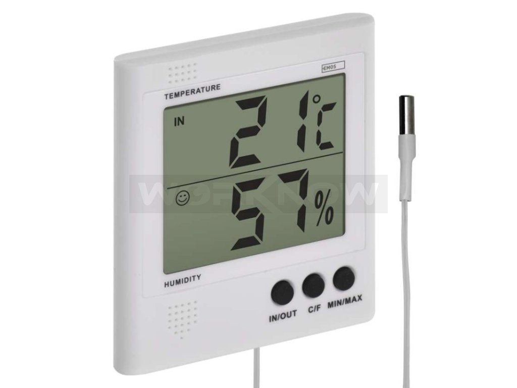 Digitální teploměr s drátovou sondou. Teploměr zaznamenává vnitřní a venkovní teplotu, vnitřní vlhkost, min. a max. teplotu a varuje před námrazou. Sonda teploměru má délku 2 m.