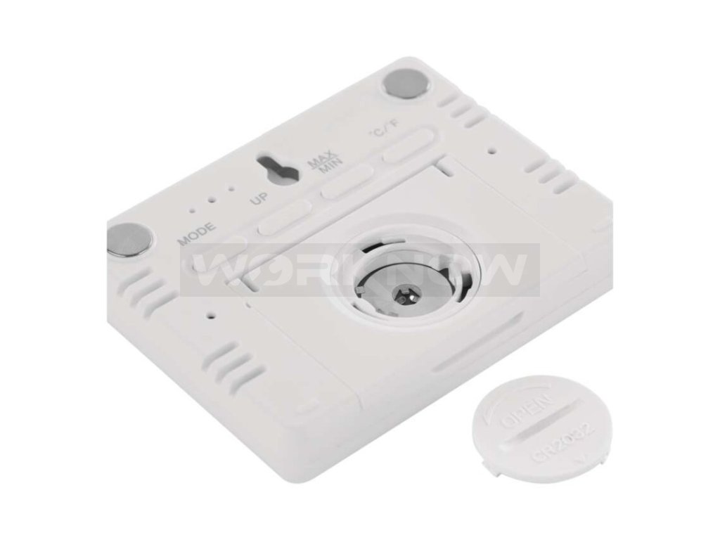 Přístroj lze postavit na stůl, zavěsit na stěnu nebo díky magnetu připevnit např. na lednici. Je napájen na 1× 3 V CR2032, která je součástí balení.