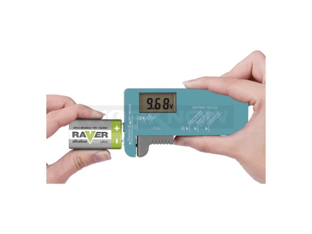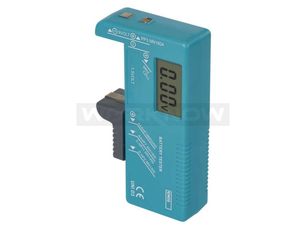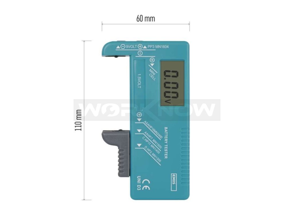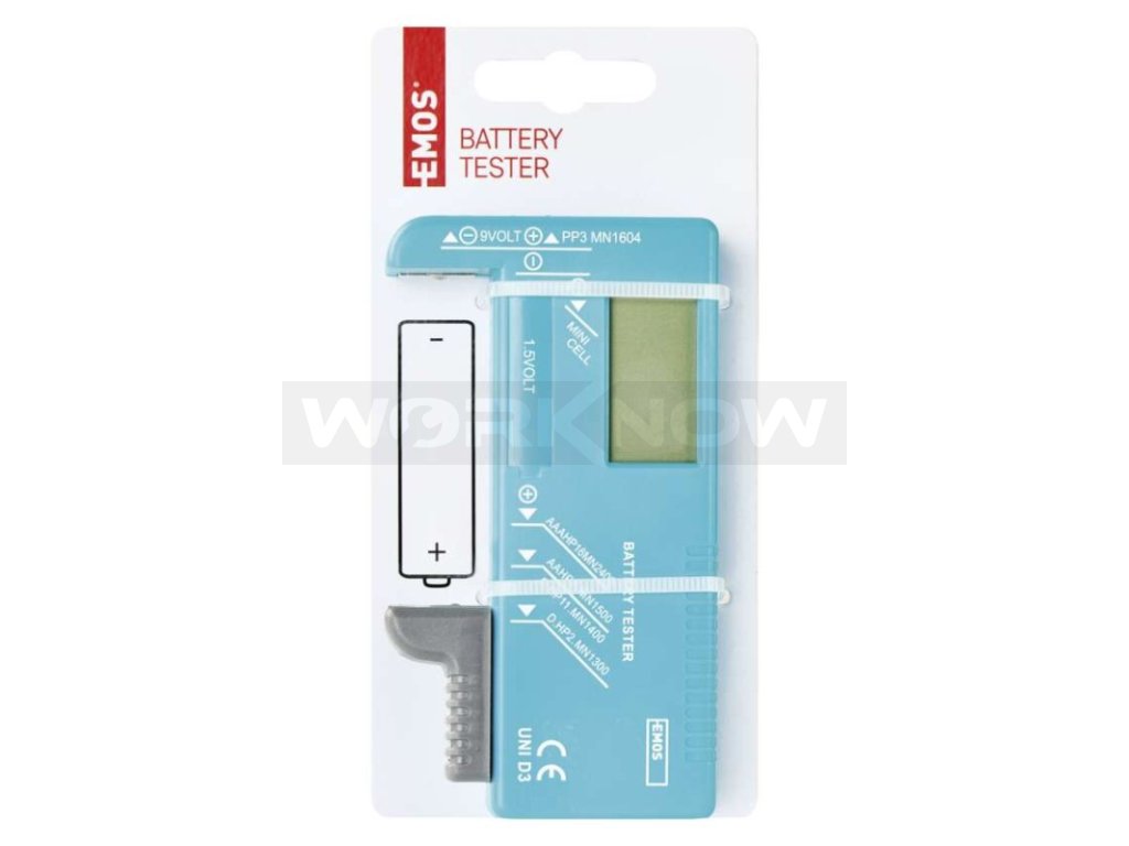 Tester baterií určený k indikaci stupně nabití (vyčerpání) baterie. Umožňuje měřit baterie velikostí N, AAA, AA, C, D, 9 V a knoflíkové baterie.