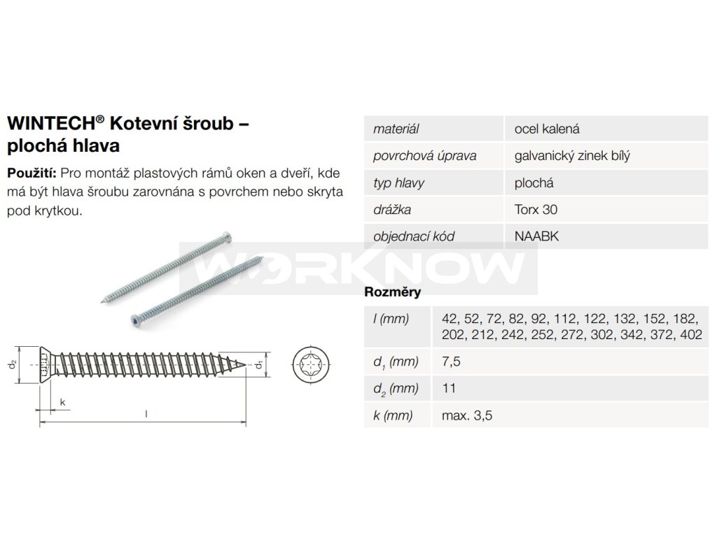 Kotevní šrouby s plochou hlavou pro montáž okenních rámů do všech typů zdiva a betonu. Konstrukce šroubu je navržena pro velmi snadné a rychlé zašroubování a dokonalou fixaci rámu ke zdivu. Torx drážka zajišťuje kvalitní přenos vysokého kroutícího momentu při aplikaci.