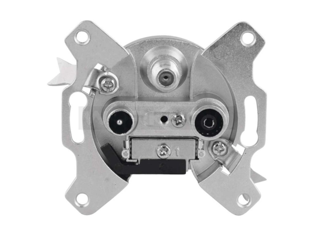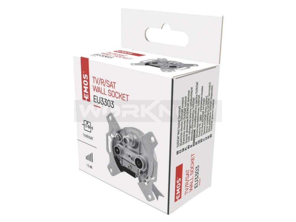 Účastnická zásuvka EU 3303 satelitní koncová s útlumem 3 dB a zdířkami pro TV + Rádio + SAT. Účastnická zásuvka propojuje např. anténu s televizí, satelitem nebo set-top-boxem. SAT zdířka průchozí pro stejnosměrné napětí a lze ji také využít pro průchod napájení předzesilovače v terestrické anténě.