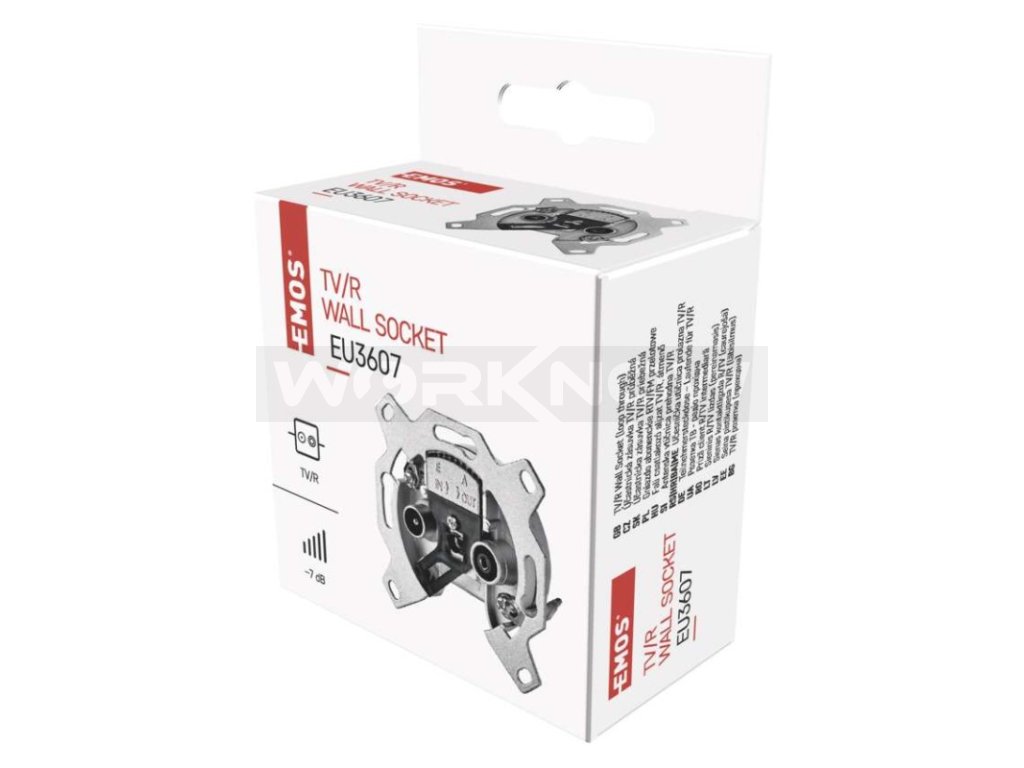 Účastnická zásuvka EU 3607 průběžná s odbočným útlumem 7 dB, průchozím útlumem 3 dB a zdířkami TV + R. Účastnická zásuvka propojuje např. anténu s televizí, satelitem nebo set-top-boxem. Zásuvka není průchozí pro stejnosměrné napětí.