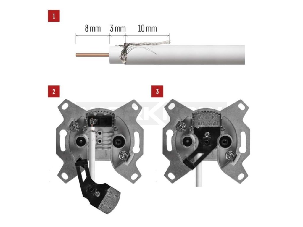 - Odšroubujte krycí část zásuvky a umístěte kabel vnitřním vodičem dovnitř dle obrázku, opletení ponechte na spodní části plášti kabelu. Vyvarujte se zkratu drátkem opletení na vnitřní vodič.