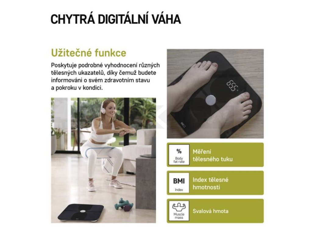 Kromě základního měření vaší hmotnosti dokáže vyhodnotit například BMI (index tělesné hmotnosti), množství tělesného tuku v těle, podíl svalové hmoty, index tělesného tuku, úrověň obezity, doporučí vaši ideální váhu a souhrnně vyhodnotí shozené či nabrané kilogramy. Tyto ukazatele vám pomohou získat přesný obraz vašeho těla a poskytnou vám cenné informace pro plánování stravy a cvičení.