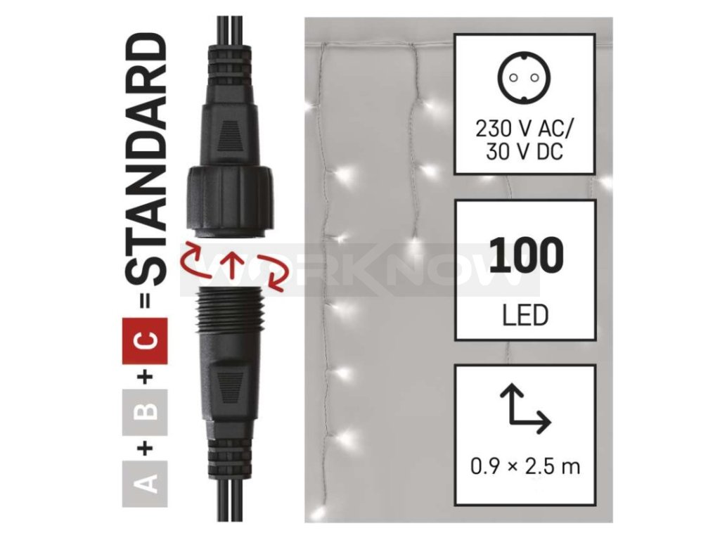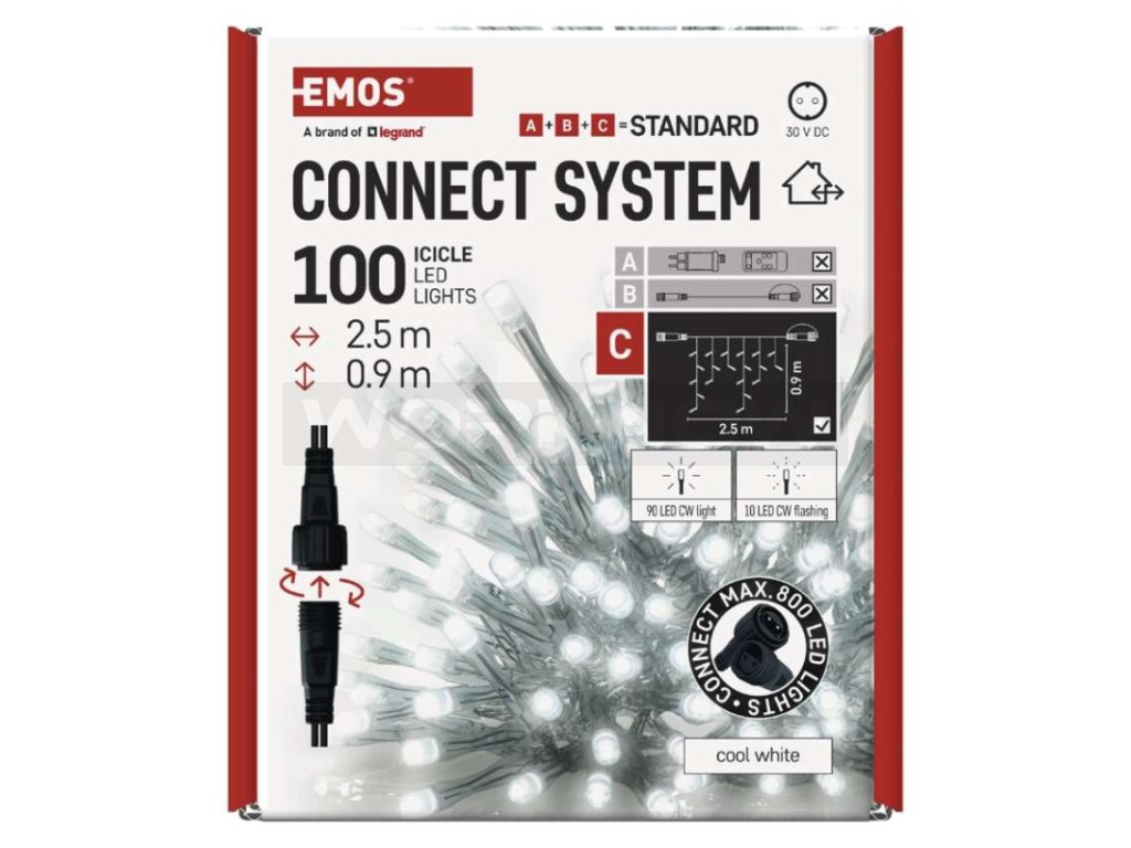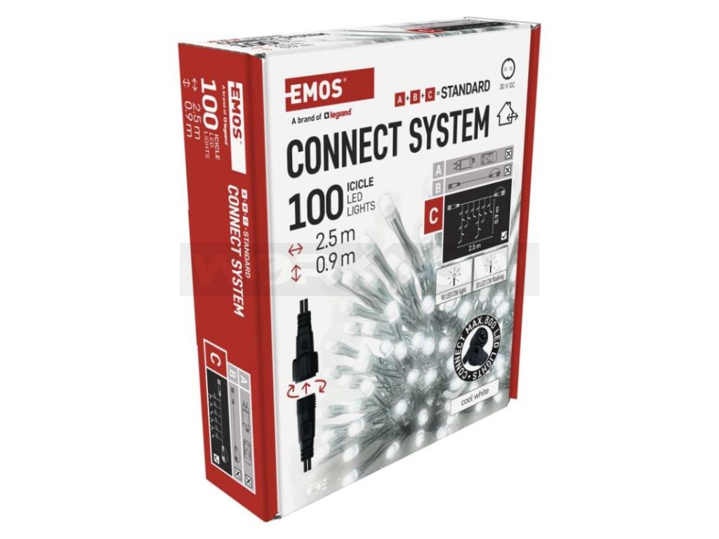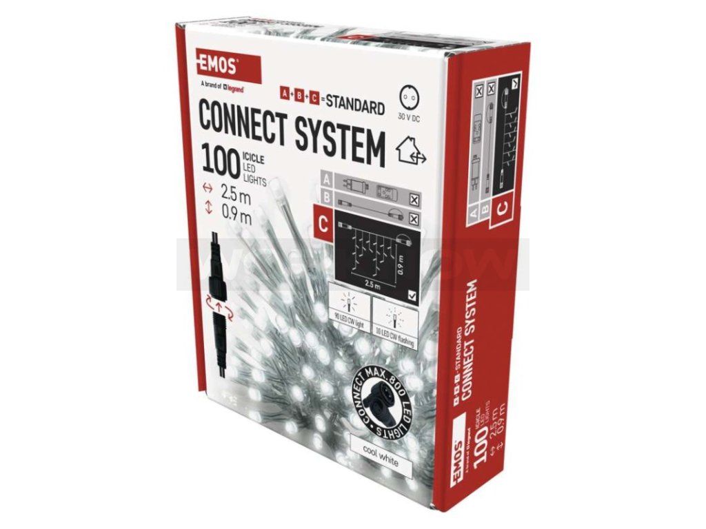 Propojovací systém CONNECT SYSTEM STANDARD je díky stupni krytí IP44 vhodný k vnitřnímu i venkovnímu použití, avšak pouze v sezónu, nikoliv po celý rok. Výhodou tohoto spojovacího systému je široká nabídka LED světelných prvků (C) v několika různých barvách. Ačkoliv je nejpopulárnějším vánočním osvětlením řetěz, ve spojovacím systému můžete vybírat podle vlastních designových preferencí z krápníků, záclon, sítí nebo hvězd na špičku vánočního stromu. Z jediného napájecího zdroje (A) připojeného k prodlužovacím kabelům, rozbočovačům (B) a světelným LED prvkům (C) je možné napájet až 800 LED světýlek.
