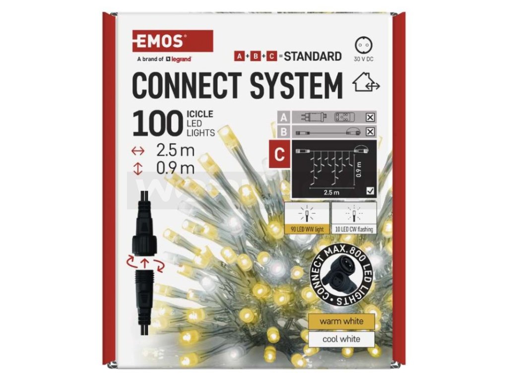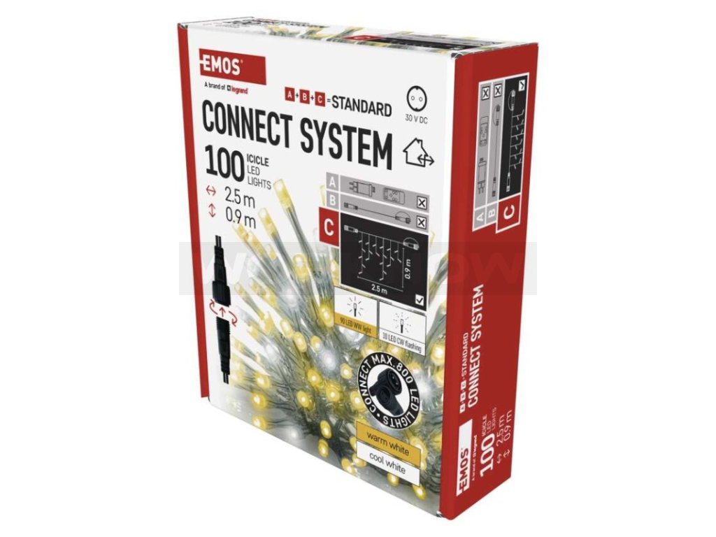 Propojovací systém CONNECT SYSTEM STANDARD je díky stupni krytí IP44 vhodný k vnitřnímu i venkovnímu použití, avšak pouze v sezónu, nikoliv po celý rok. Výhodou tohoto spojovacího systému je široká nabídka LED světelných prvků (C) v několika různých barvách. Ačkoliv je nejpopulárnějším vánočním osvětlením řetěz, ve spojovacím systému můžete vybírat podle vlastních designových preferencí z krápníků, záclon, sítí nebo hvězd na špičku vánočního stromu. Z jediného napájecího zdroje (A) připojeného k prodlužovacím kabelům, rozbočovačům (B) a světelným LED prvkům (C) je možné napájet až 800 LED světýlek.