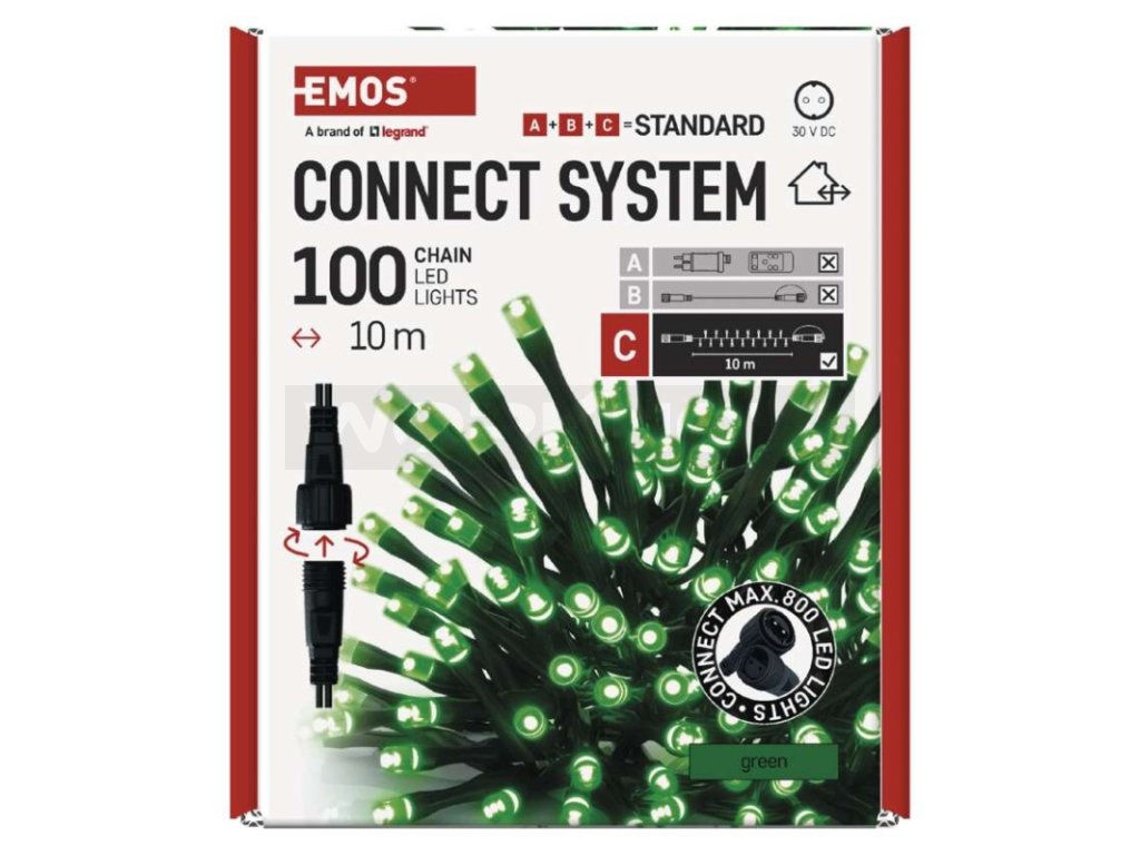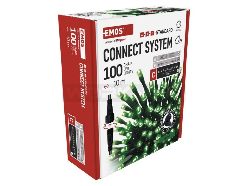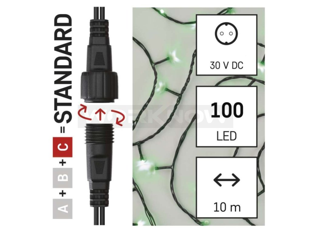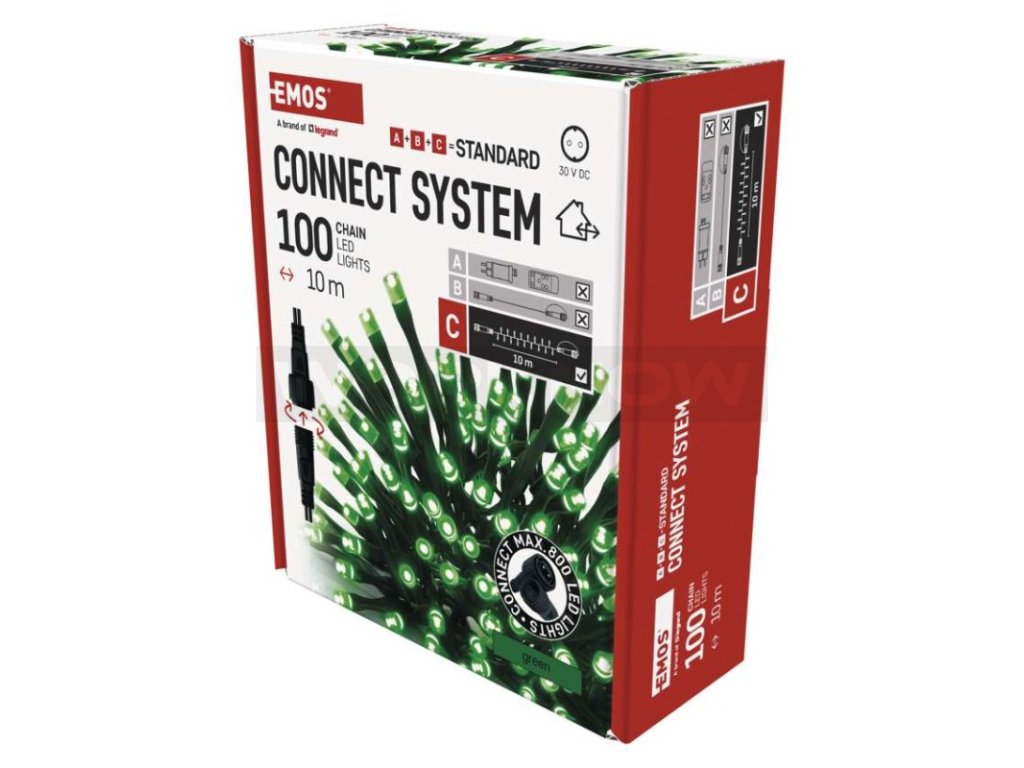 Propojovací systém CONNECT SYSTEM STANDARD je díky stupni krytí IP44 vhodný k vnitřnímu i venkovnímu použití, avšak pouze v sezónu, nikoliv po celý rok. Výhodou tohoto spojovacího systému je široká nabídka LED světelných prvků (C) v několika různých barvách. Ačkoliv je nejpopulárnějším vánočním osvětlením řetěz, ve spojovacím systému můžete vybírat podle vlastních designových preferencí z krápníků, záclon, sítí nebo hvězd na špičku vánočního stromu. Z jediného napájecího zdroje (A) připojeného k prodlužovacím kabelům, rozbočovačům (B) a světelným LED prvkům (C) je možné napájet až 800 LED světýlek.