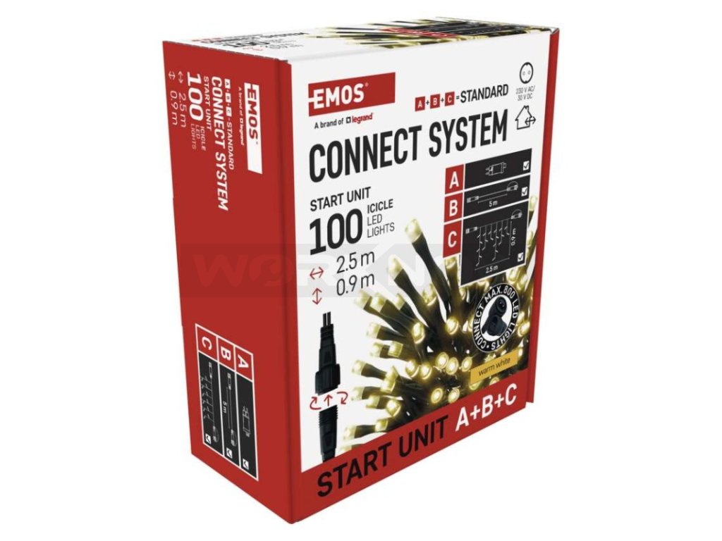 Základní sada systému CONNECT STANDARD obsahuje vše potřebné k tomu, abyste mohli ihned začít s výzdobou vašeho domu, zahrady nebo interiéru. V jednom balení naleznete tři základní komponenty systému nutné pro jeho provoz – napájecí zdroj s časovačem (A), prodlužovací kabel o délce 5 m (B) a vánoční krápníky (rampouchy) o délce 2,5 m se 100 LED diodami (C).