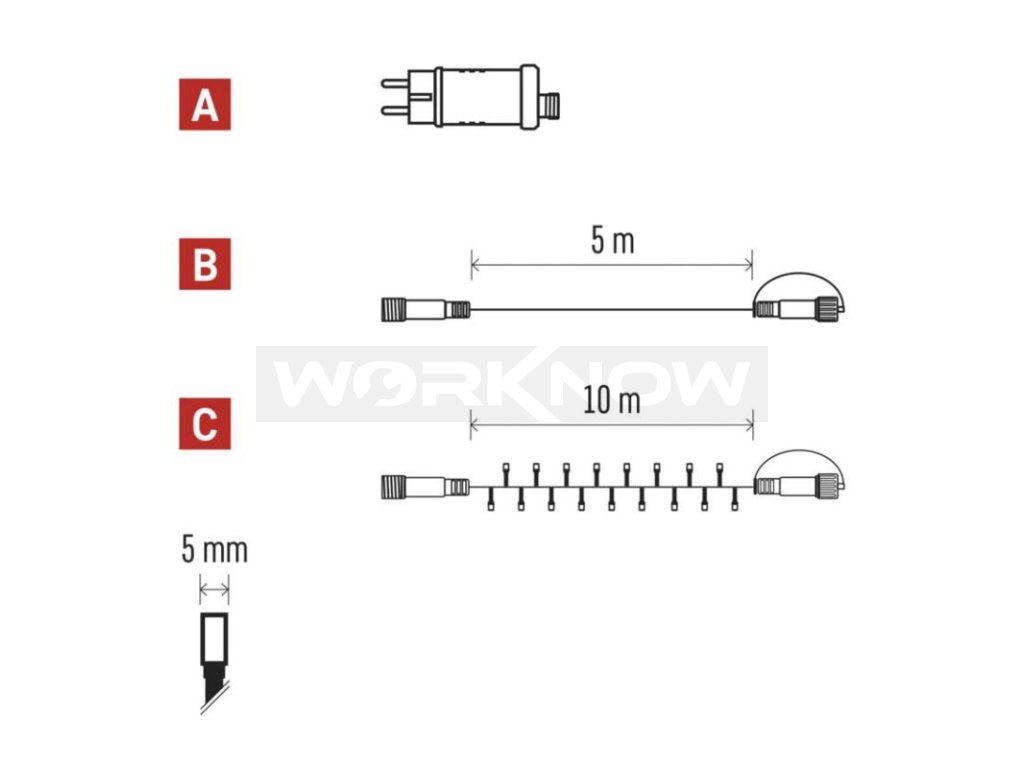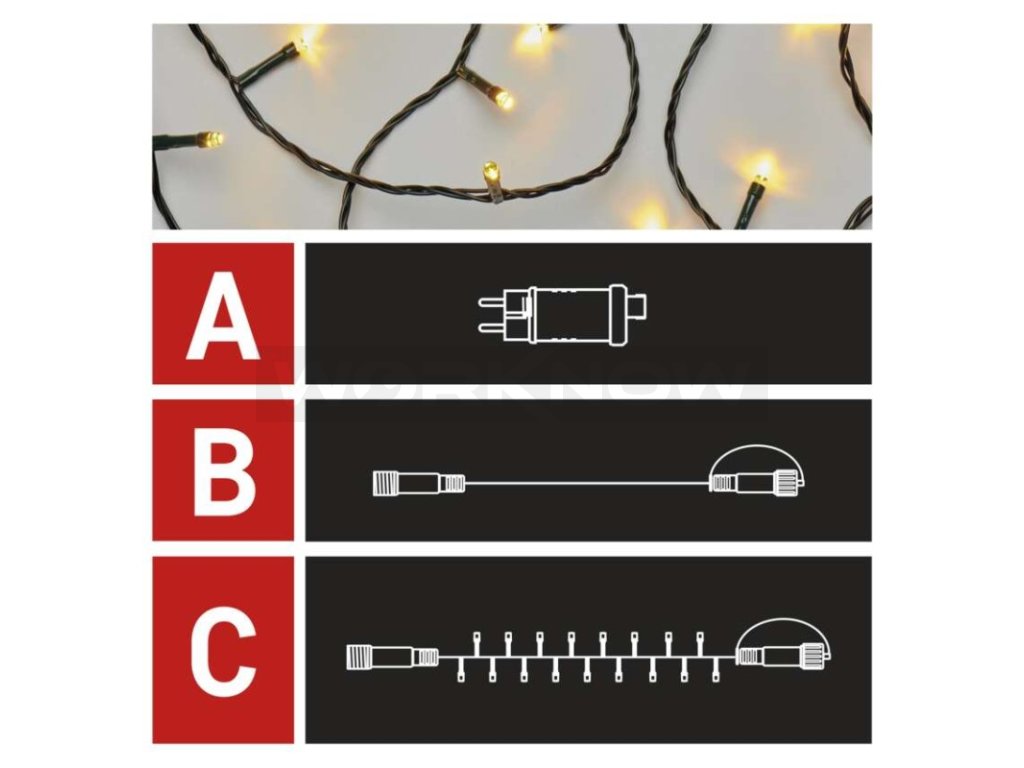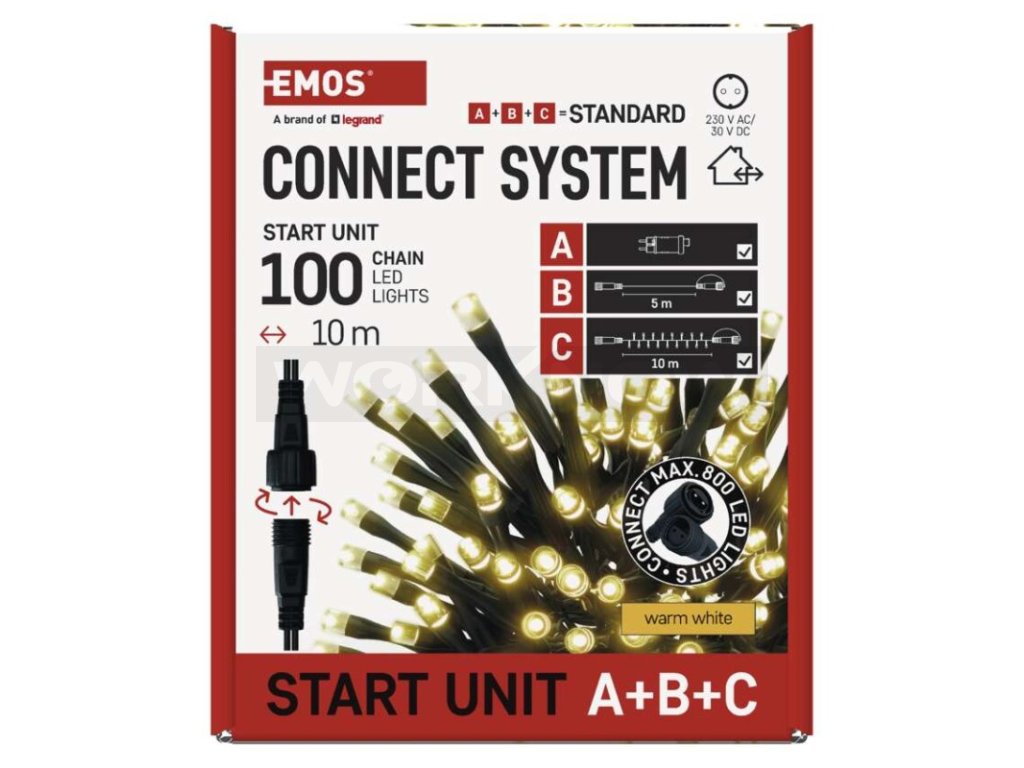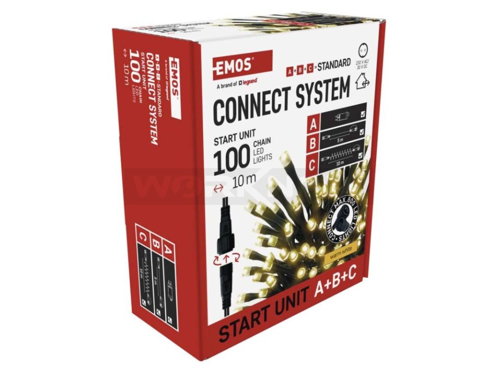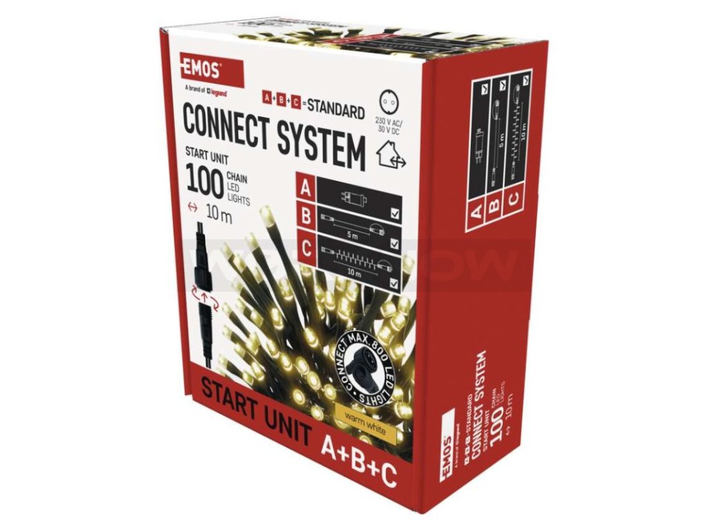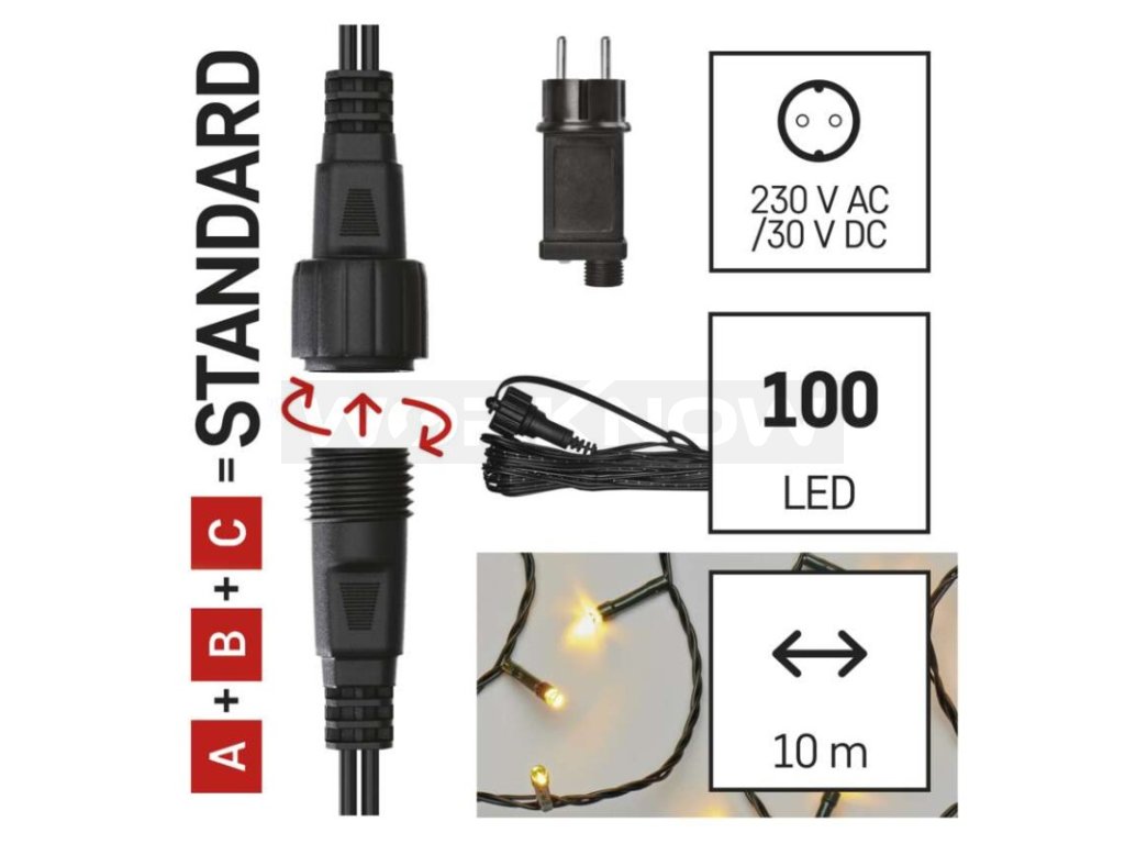 Základní sada systému CONNECT STANDARD obsahuje vše potřebné k tomu, abyste mohli ihned začít s výzdobou vašeho domu, zahrady nebo interiéru. V jednom balení naleznete tři základní komponenty systému nutné pro jeho provoz – napájecí zdroj s časovačem (A), prodlužovací kabel o délce 5 m (B) a vánoční řetěz o délce 10 metrů se 100 LED diodami (C).