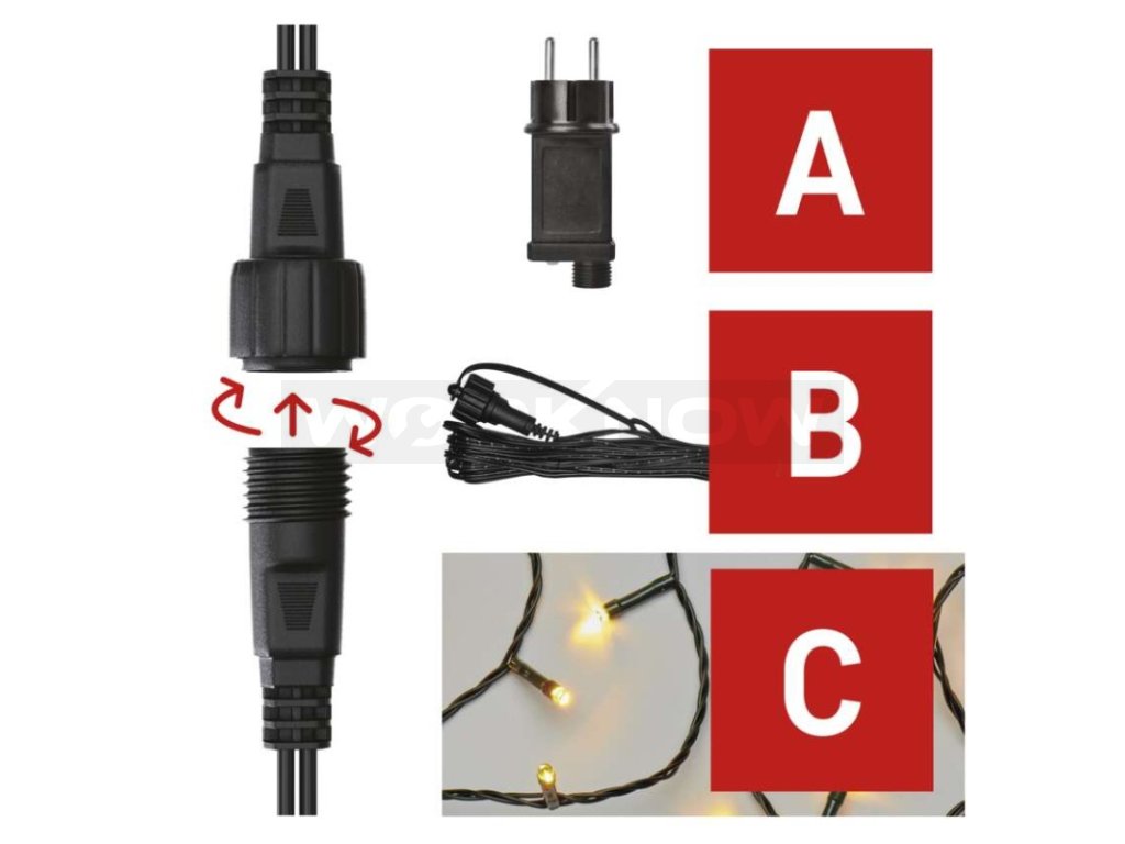 Začněte zdrojem (A), připojte k němu prodlužovací kabel (B), vánoční řetěz (C) a pusťte se do zdobení trámů, balkónů, venkovních altánů, přístřešků, plotů a okapů. Základní sadu můžete postupně rozšiřovat o další komponenty systému, vzájemně je propojovat a kombinovat.