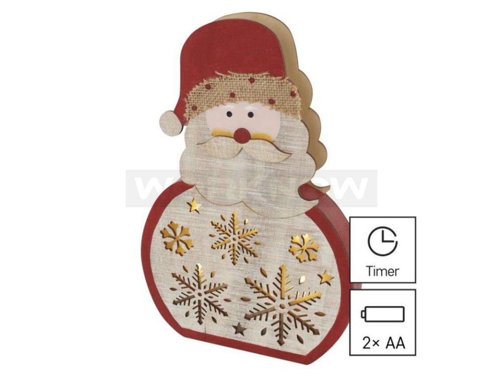 LED dekorace dřevěná – Santa, 30 cm, 2x AA, vnitřní, teplá bílá, časovač