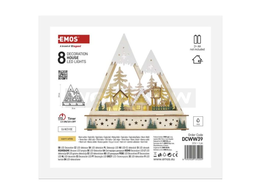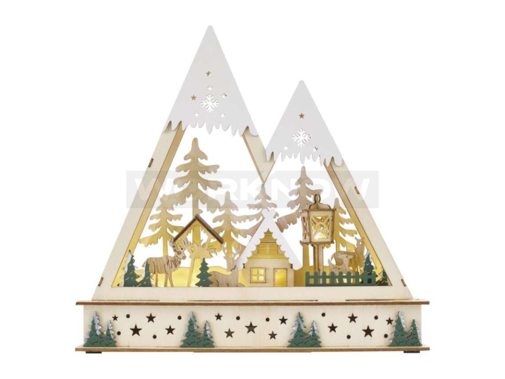 Přineste kouzlo zimní krajiny do svého domova s touto dřevěnou vánoční LED ozdobou. Vyřezávaná dekorace s motivem zasněžených hor a prvky lesa, je dokonalým doplňkem vaší slavnostní adventní výzdoby. LED dekorace je vybavena třípolohovým spínačem. Ten umožňuje nastavení do režimů OFF pro vypnutí, TIMER pro automatické svícení po dobu 6 hodin denně s následným vypnutím na 18 hodin, a ON pro stálé svícení. Teplé bílé světlo vytvoří ve vašem domově útulnou a příjemnou atmosféru. Napájení je zajištěno dvěma AA bateriemi, které snadno vyměníte v případě potřeby. Tato dřevená dekorace je nejen krásným dekorativním prvkem, ale také praktickým pomocníkem pro vytvoření kouzelné zimní atmosféry.