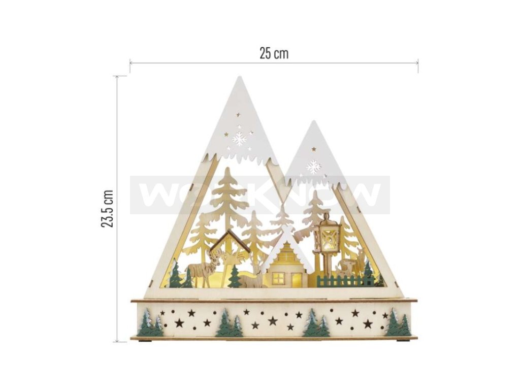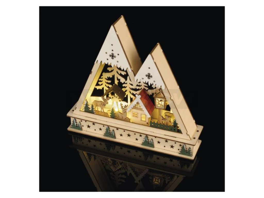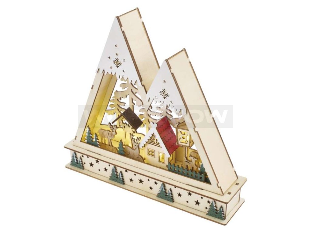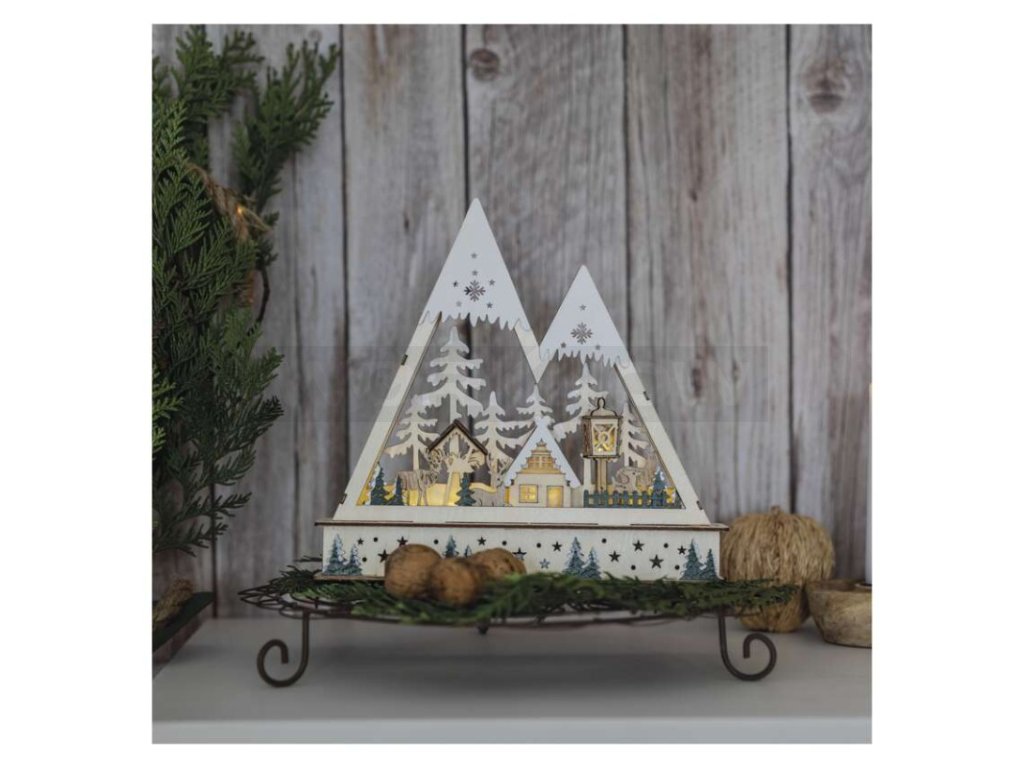 LED dřevěná vánoční krajina, 23,5 cm, 2x AA, vnitřní, teplá bílá, časovač