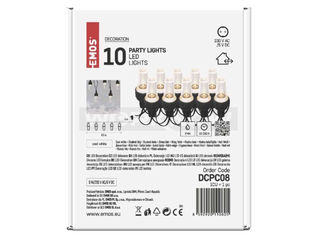LED světelný řetěz – 10x párty žárovky, 4,5 m, venkovní i vnitřní, studená bílá