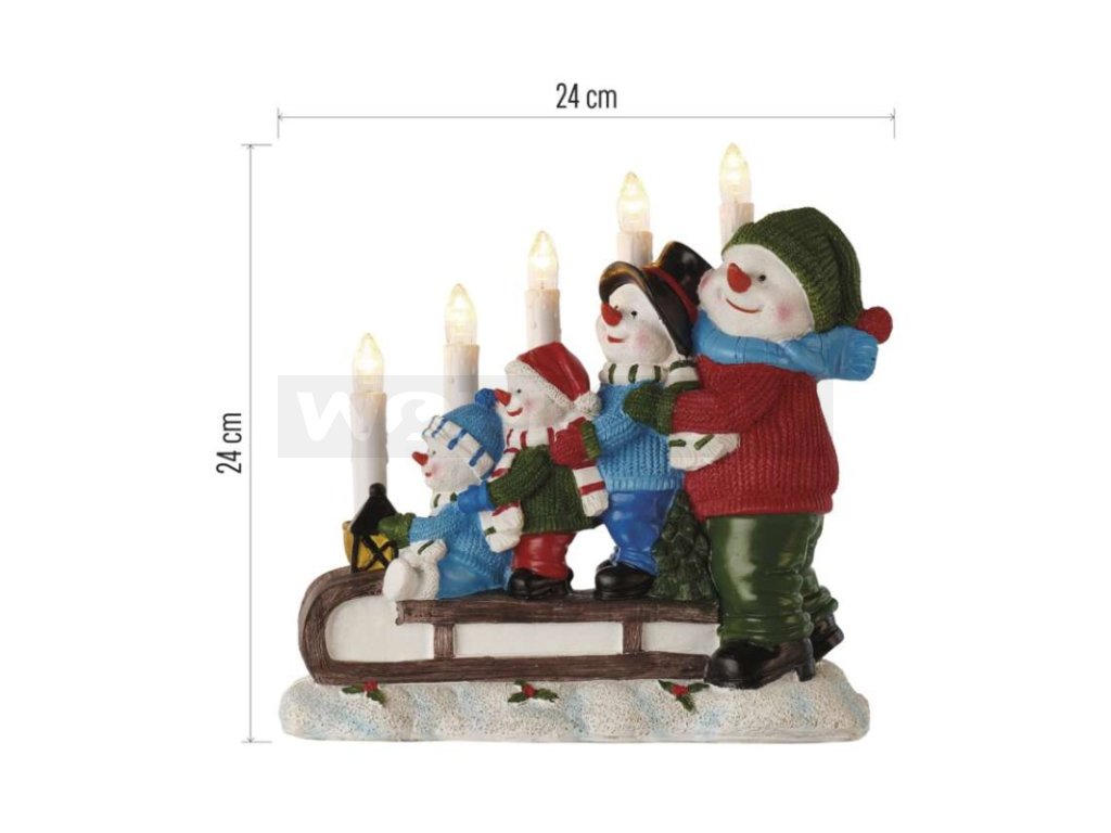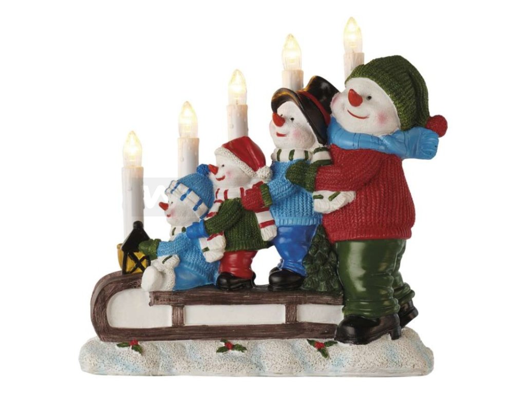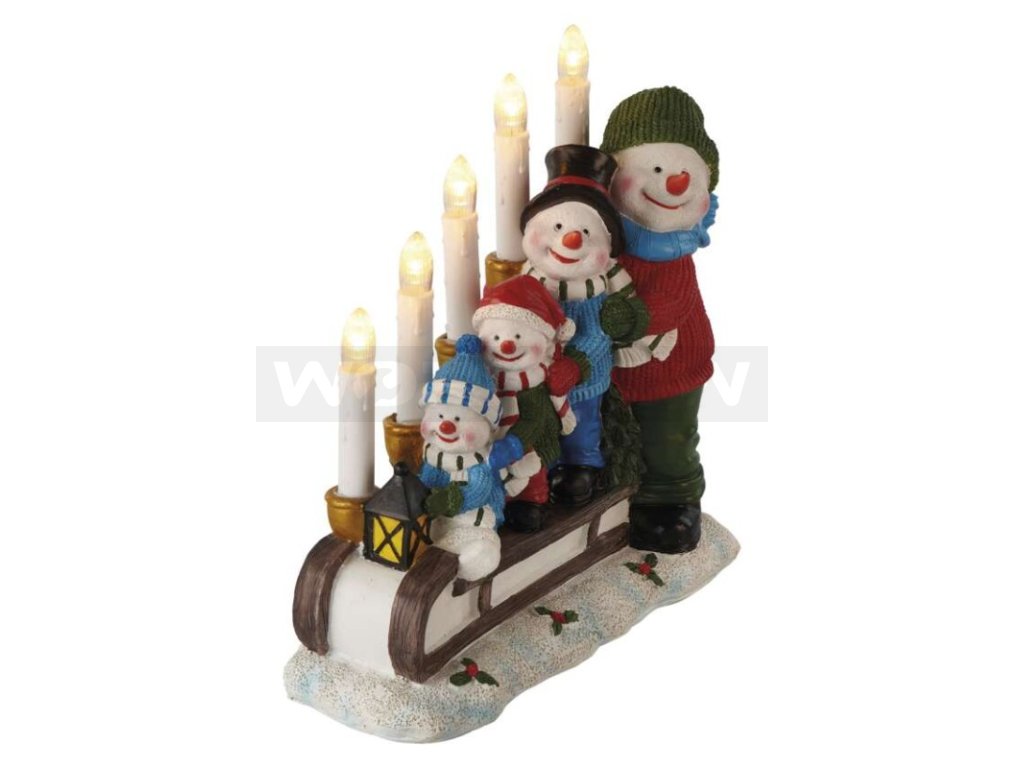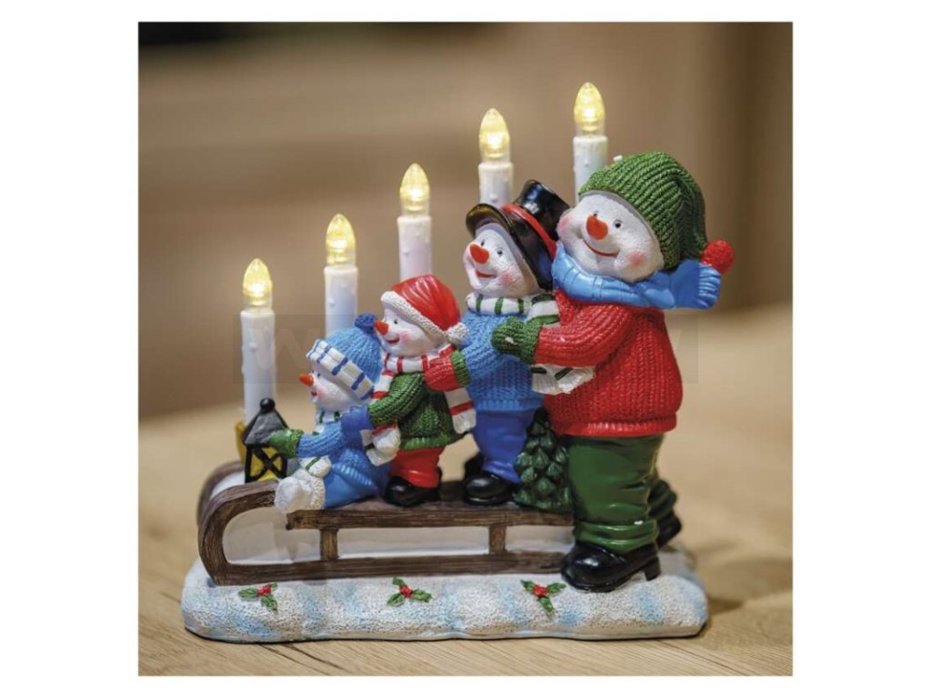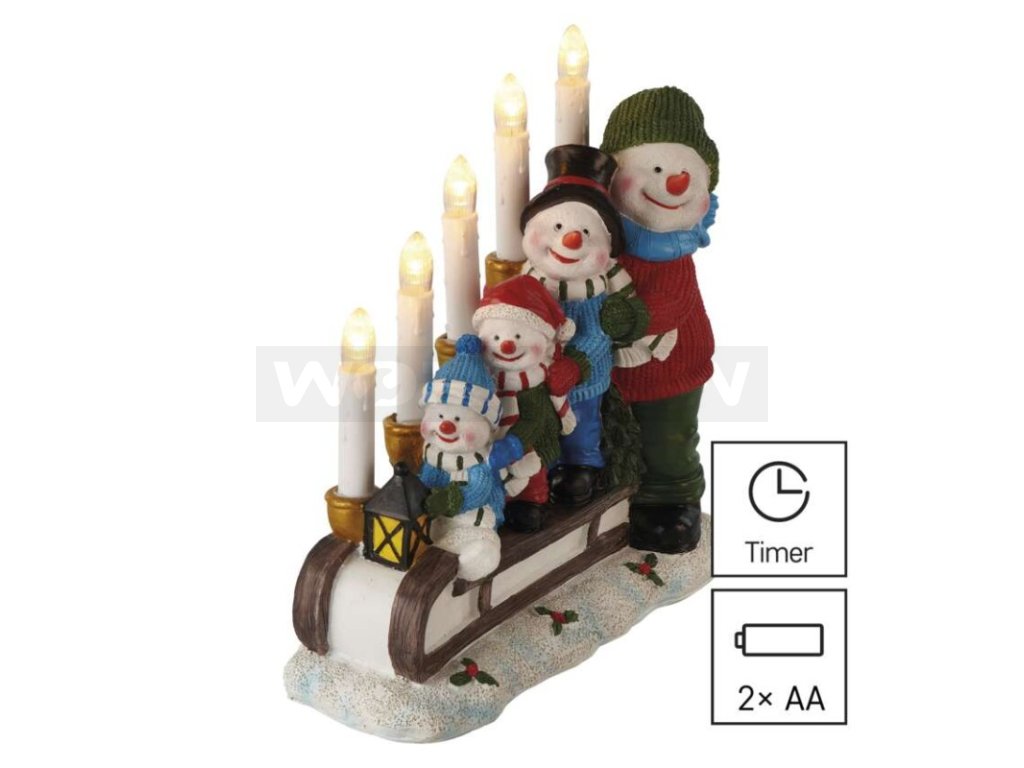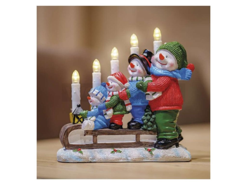 LED svícen – sněhuláci na saních, 24 cm, 2x AA, vnitřní, teplá bílá, časovač