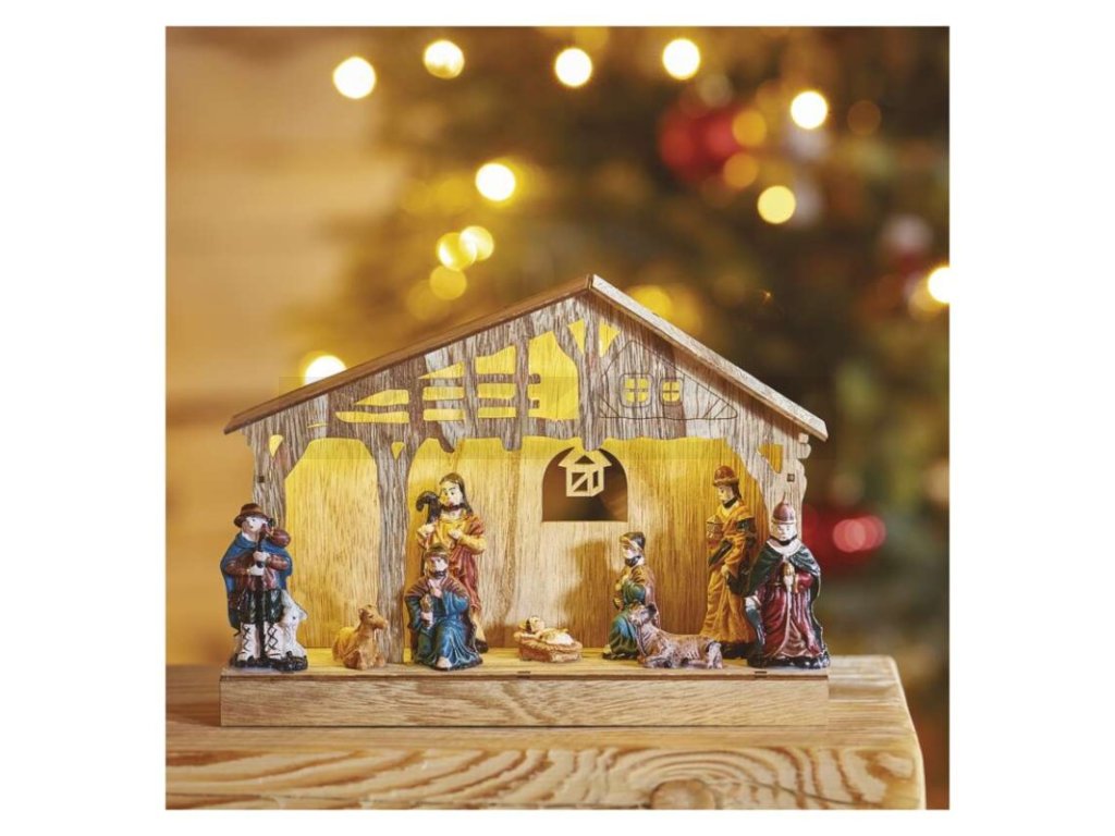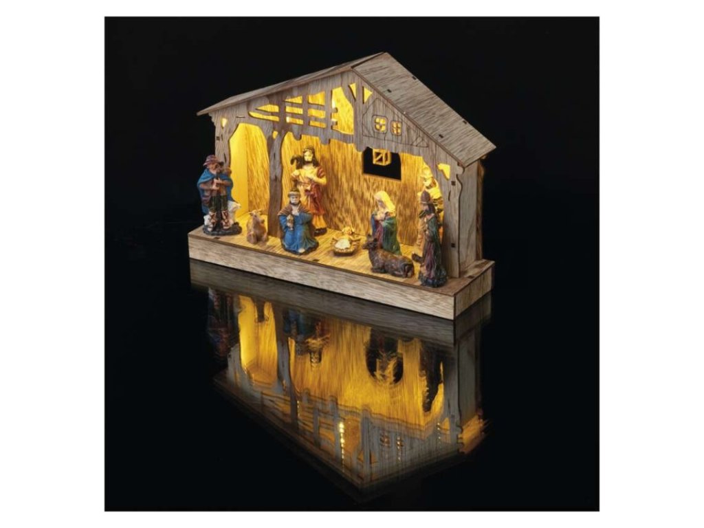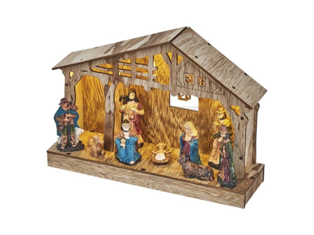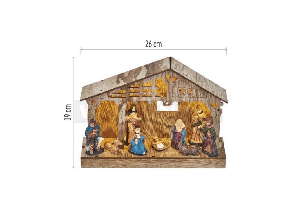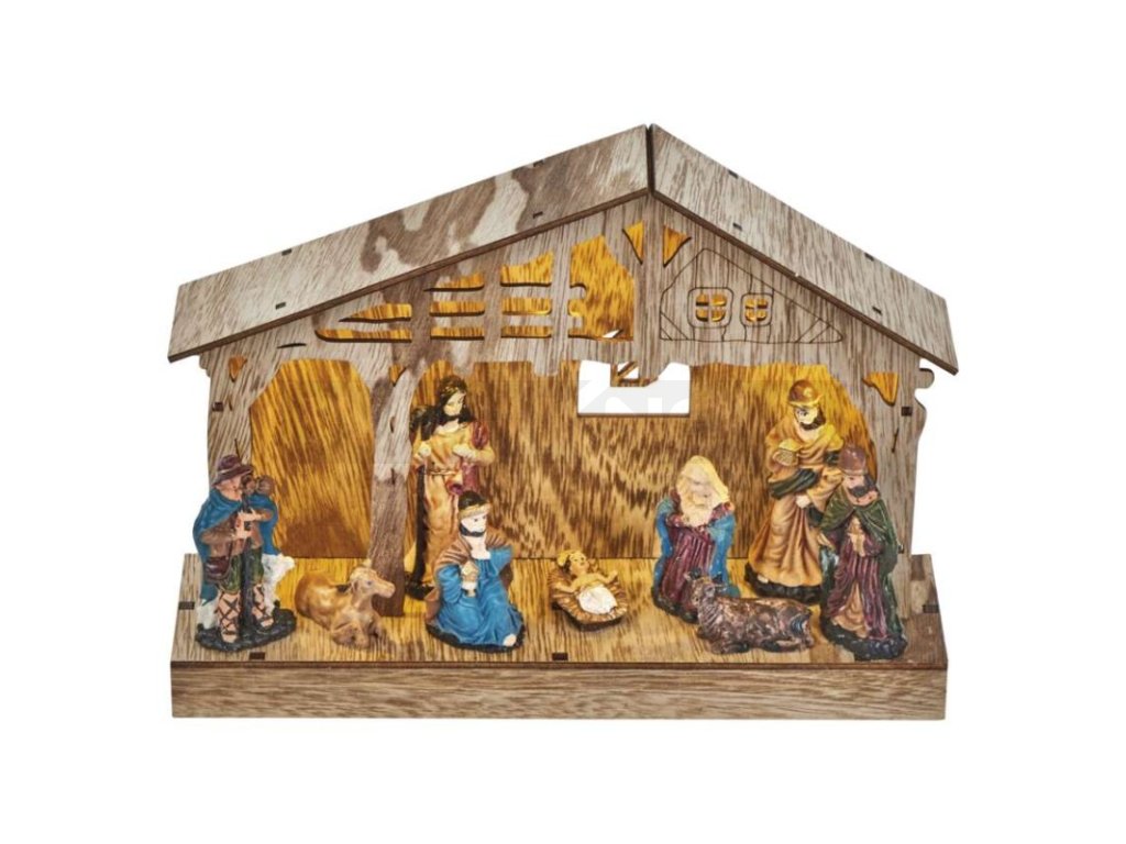 Dřevěné dekorace navozují atmosféru tradičních Vánoc charakteristických vůní perníčků, zvukem vánočních koled a nezaměnitelnou chutí bramborového salátu. Dřevěná dekorace "vánoční betlém" je vybavena příjemným teple bílým osvětlením. Díky napájení pomocí AA baterií ji můžete umístit na libovolné místo ve vašem interiéru a skvěle se bude vyjímat zejména na okenním parapetu, komodě či televizním stolku.