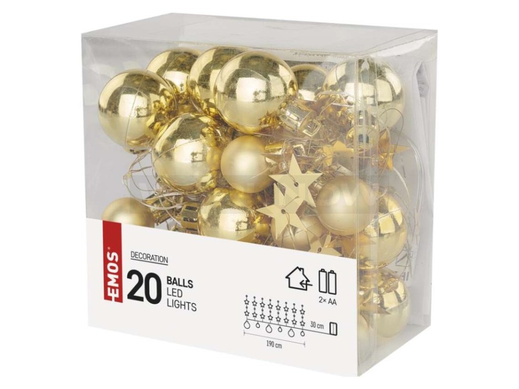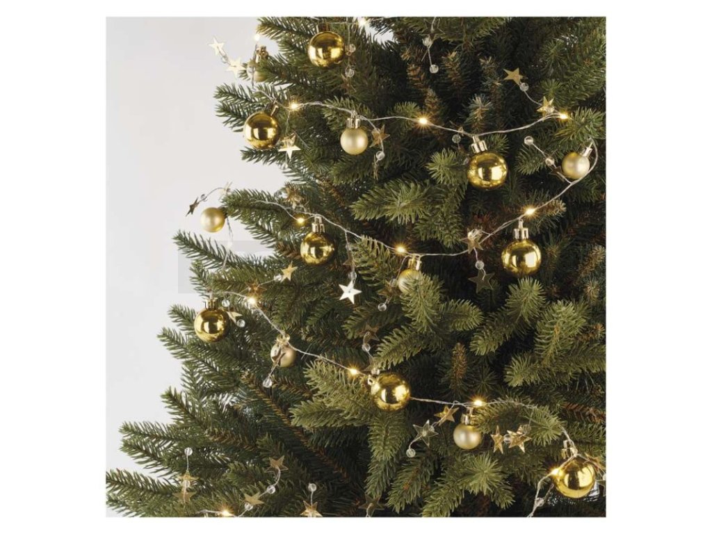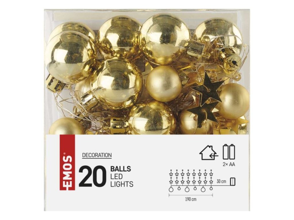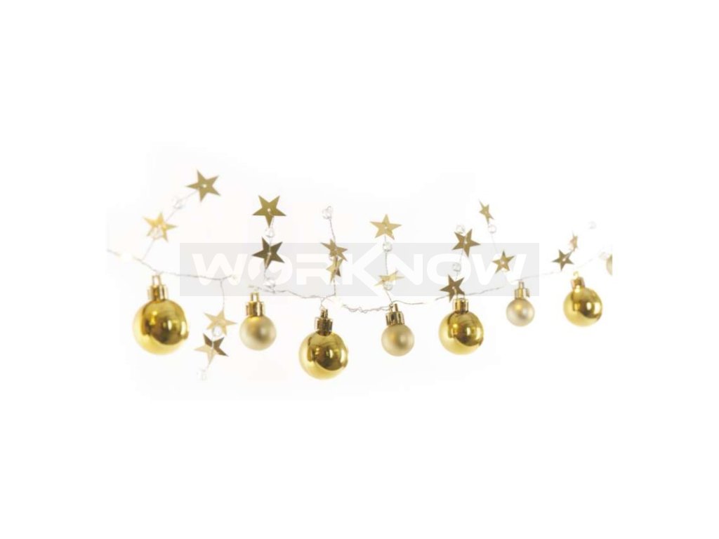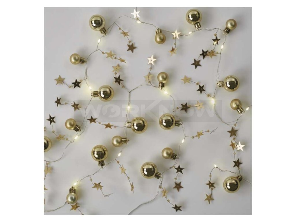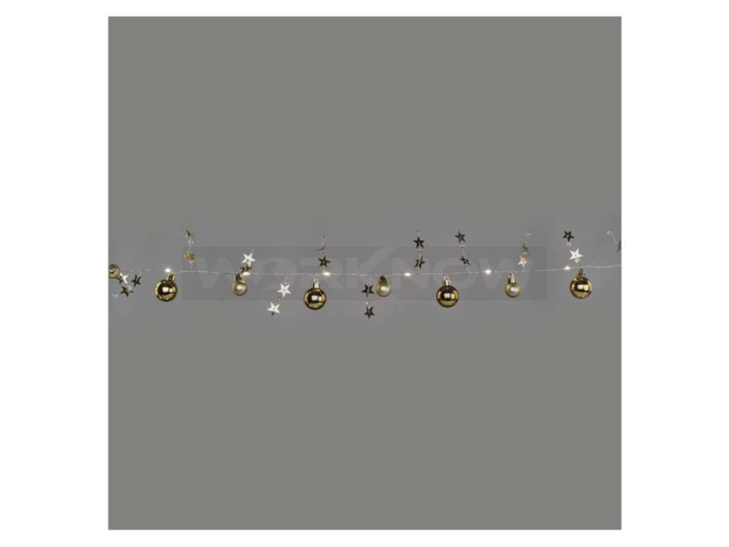 LED vánoční girlanda – zlaté koule s hvězdami, 1,9 m, 2x AA, vnitřní, teplá bílá, časovač