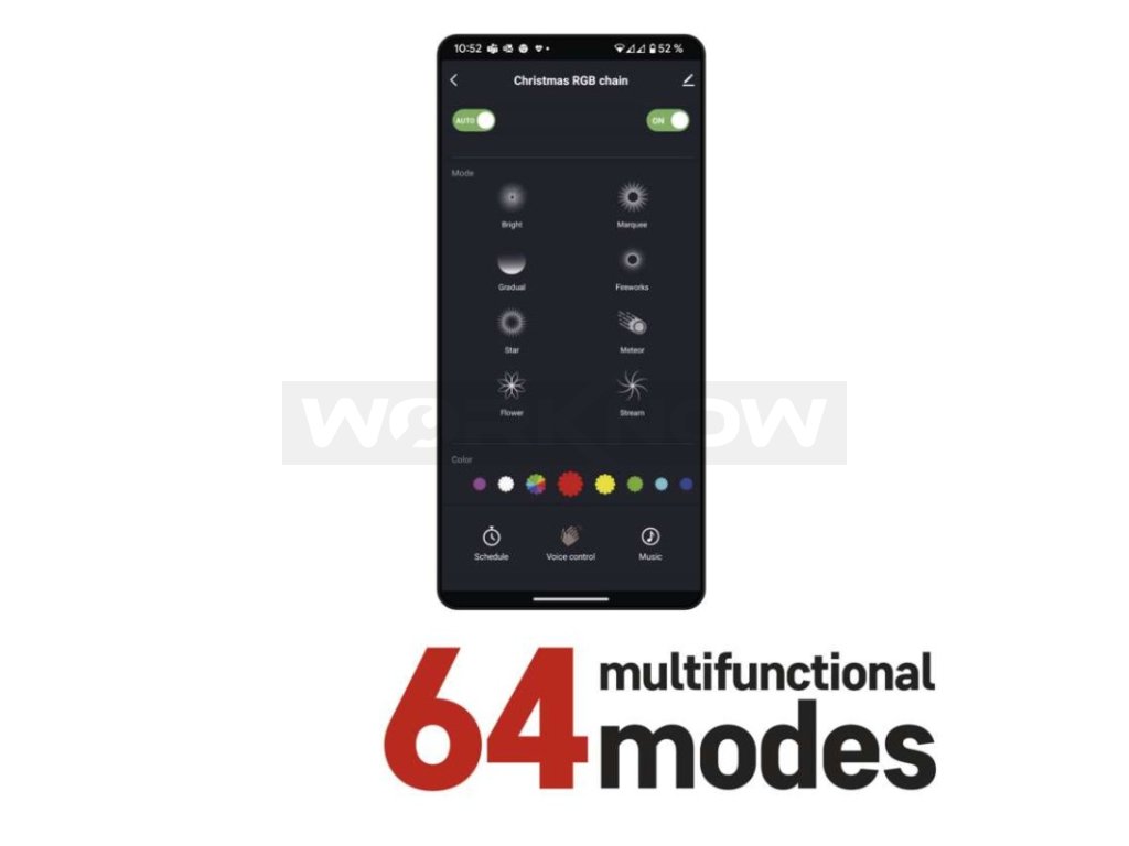 GoSmart LED vánoční řetěz disponuje 64 světelnými módy. Máte rádi klasické osvětlení v teplé nebo studené barvě, nebo naopak preferujete barevné a blikající osvětlení? Nastavte si jedinečnou a neopakovatelnou scénu přesně podle vašeho stylu a vkusu. Jednotlivé módy se liší barvou světla, typem blikání, postupným rozsvěcováním nebo změnou barvy LED světýlek. Vybírat můžete z 8 funkcí blikání a 8 různých RGB barev.