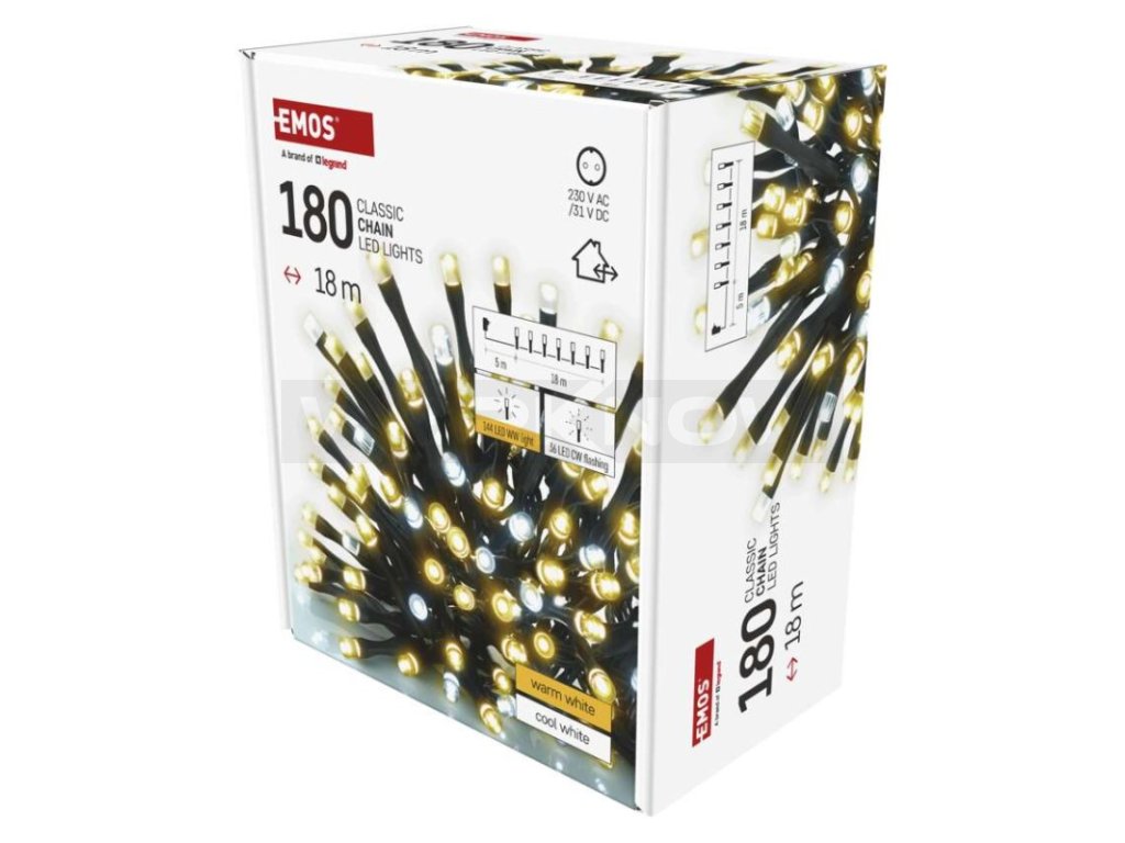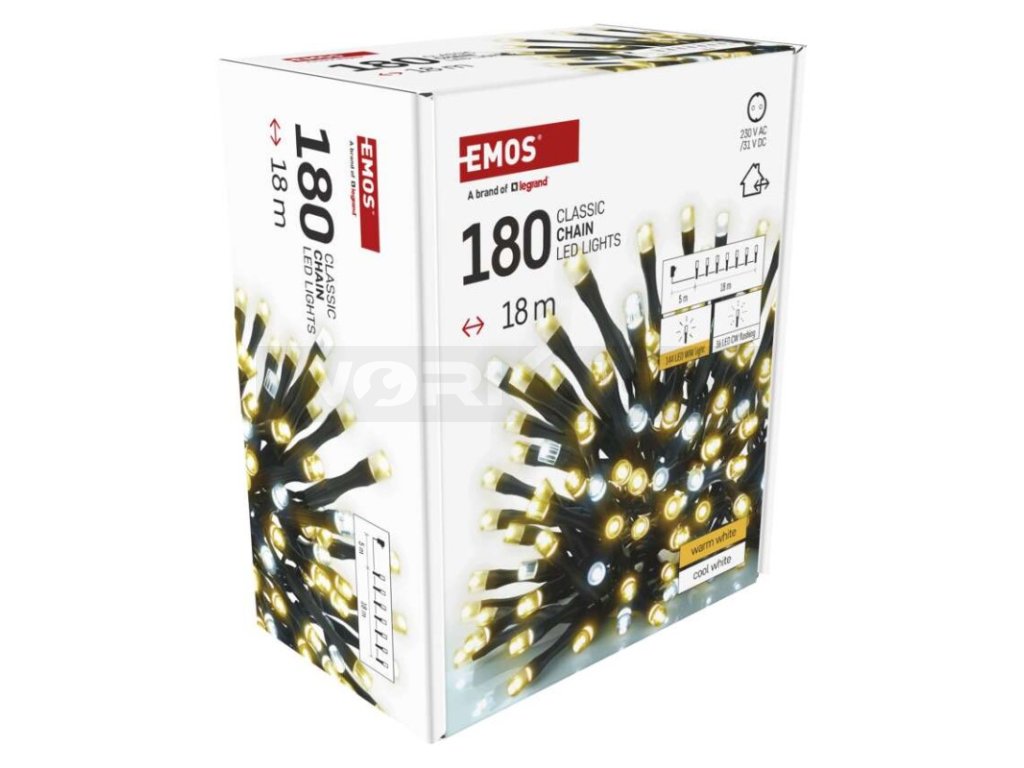 Pro rozsvícení nejen vánočního stromečku nabízíme pod značkou EMOS nepřeberné množství LED řetězů, které vynikají nízkou spotřebou elektrické energie a dlouhou životností. Vybírat můžete z řetězů určených výhradně do interiéru (IP20), exteriéru (IP44) nebo řetězů na baterie, které jsou ideální k dekorování míst bez přístupu k zásuvce. K dispozici jsou čtyři řady LED světelných řetězů, které se liší velikostí LED diody a jejím tvarem – NANO – CLASSIC – CHERRY – TRADITIONAL. Rozhodujícím kritériem při volbě správného řetězu jsou jeho délka, počet LED diod a barva světla.