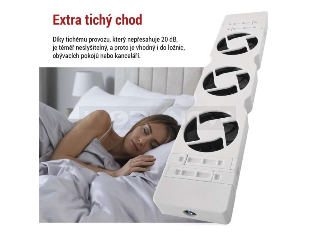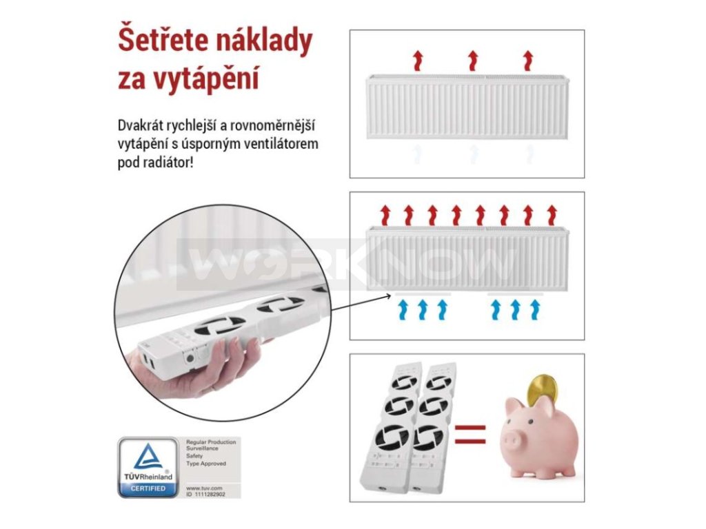 Umožňuje rychlejší a rovnoměrnější rozdělení tepla po místnosti, čímž snižuje potřebu vysokých teplot na termostatu. Skvělý pomocník pro dosažení efektivního vytápění a úspory spotřebované energie.