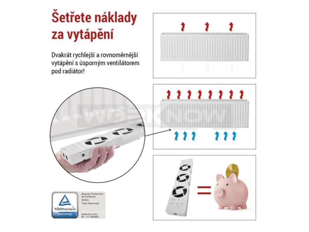 Umožňuje rychlejší a rovnoměrnější rozdělení tepla po místnosti, čímž snižuje potřebu vysokých teplot na termostatu. Skvělý pomocník pro dosažení efektivního vytápění a úspory spotřebované energie.