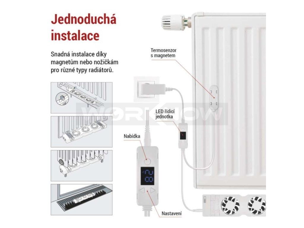 Ventilátor pod radiátor pro zvýšení účinnosti vytápění.Výhody produktuZvýšení vytápění domácnosti - umožňuje snížit teplotu topného systému.Úspora nákladů na energii.Velmi nízká spotřeba energie.Komfort díky rychlému vyhřátí domácnosti.Snadná instalace a montáž na většinu ocelových teplovodních radiátorů a konvektorů.