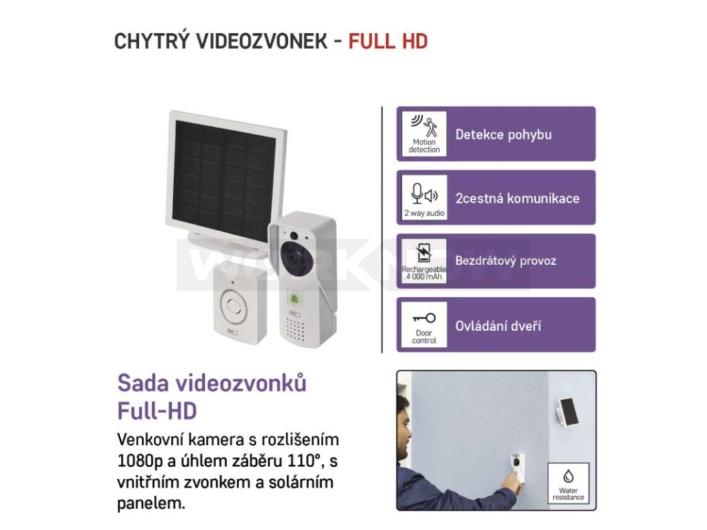 | obsah balení: | 1× dveřní kamerová jednotka, 2× baterie Li-Ion 18650, 1× dešťová clona, 1× solární panel, 1× propojovací kabel, 1× bezdrátový zvonek, 1× instalační materiál, 1× manuál |