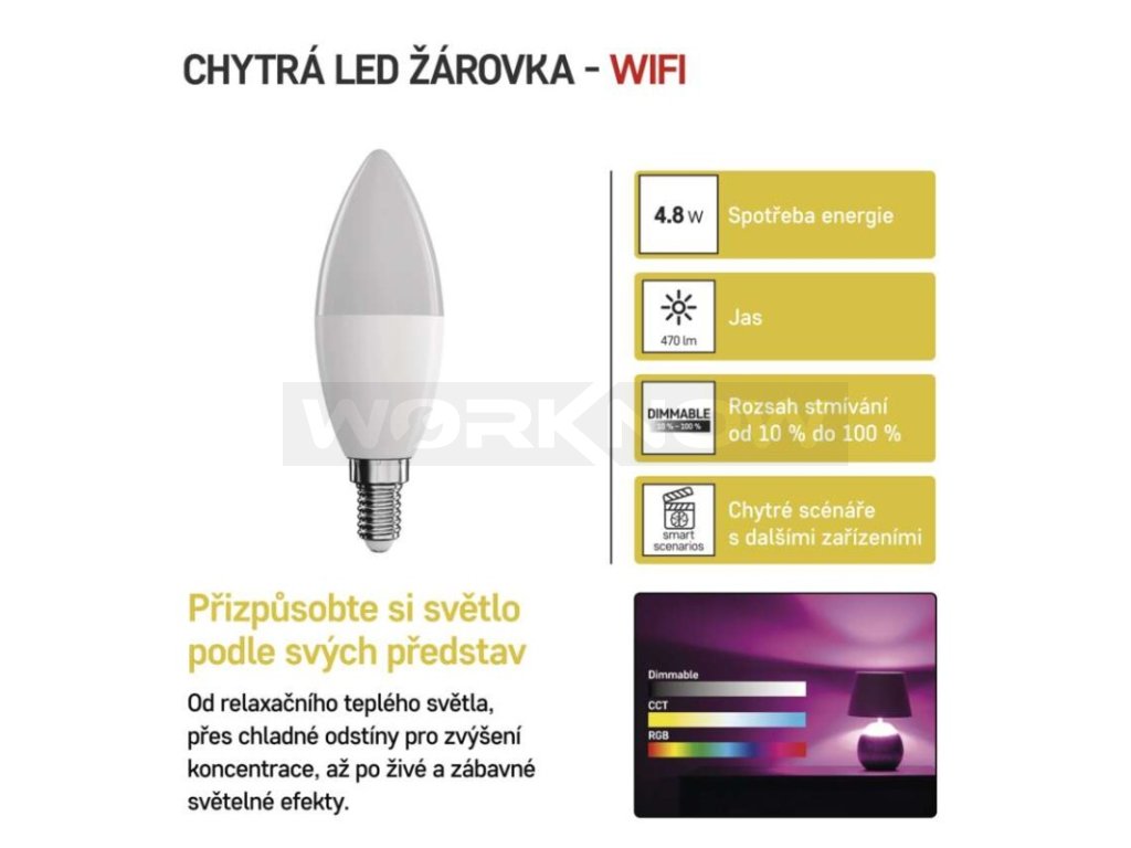 Chytrá žárovka je ideální doplněk pro každou moderní domácnost bez ohledu na to, zda potřebujete intenzivní bílé světlo pro práci nebo tlumené teplé světlo pro večerní sledování televize. EMOS GoSmart žárovky se vám vždy přizpůsobí a stanou se klíčem k domácí automatizaci. Vytvářejte s nimi světelné scény a využijte nastavení osvětlení v domácnosti, od stmívání až po různé barevné tóny světla.