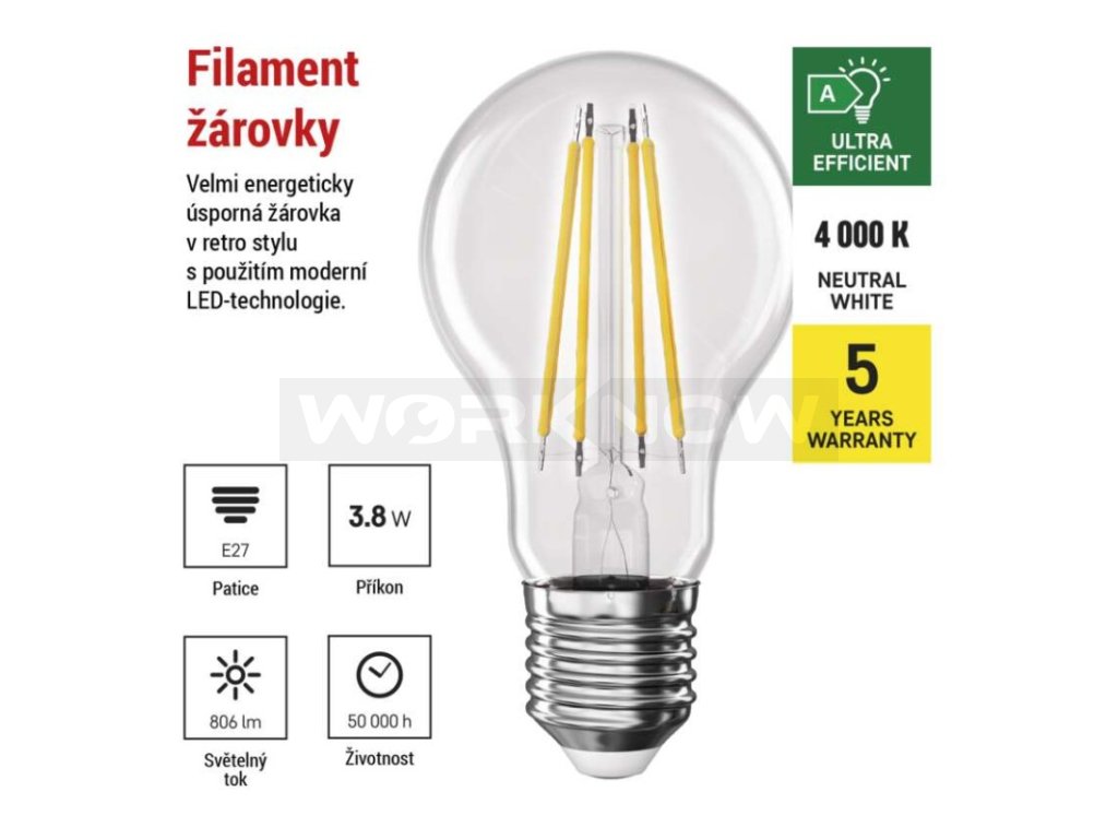 LED žárovka Filament A60 A CLASS/ E27 / 3,8 W (60 W) / 806 lm / neutrální bílá