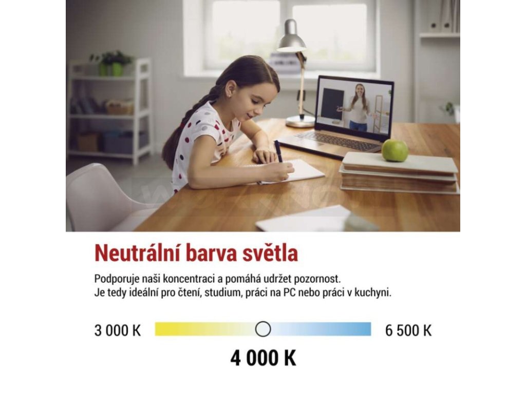 Neutrálně bílá barva je nejblíže teplotě denního světla a pomáhá lépe udržovat koncentraci. Skvěle se tak hodí domů do kuchyně, pracovny anebo do kanceláří či obchodů. Díky běžnému typu patice E27 si žárovku snadno naistalujete třeba do lampičky nebo lustru.