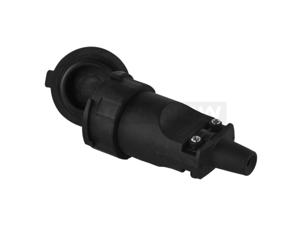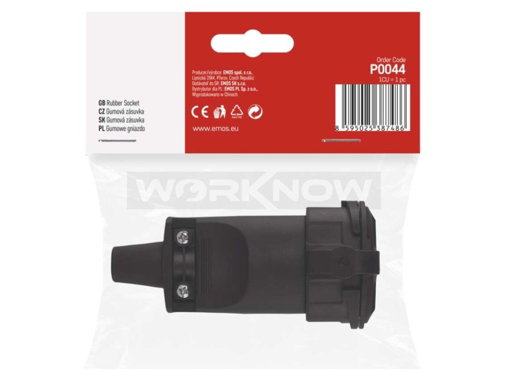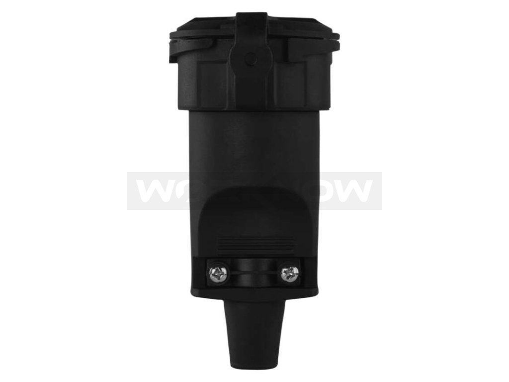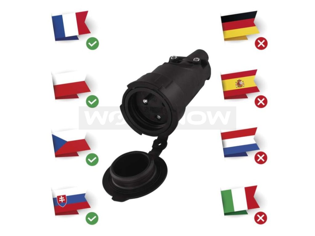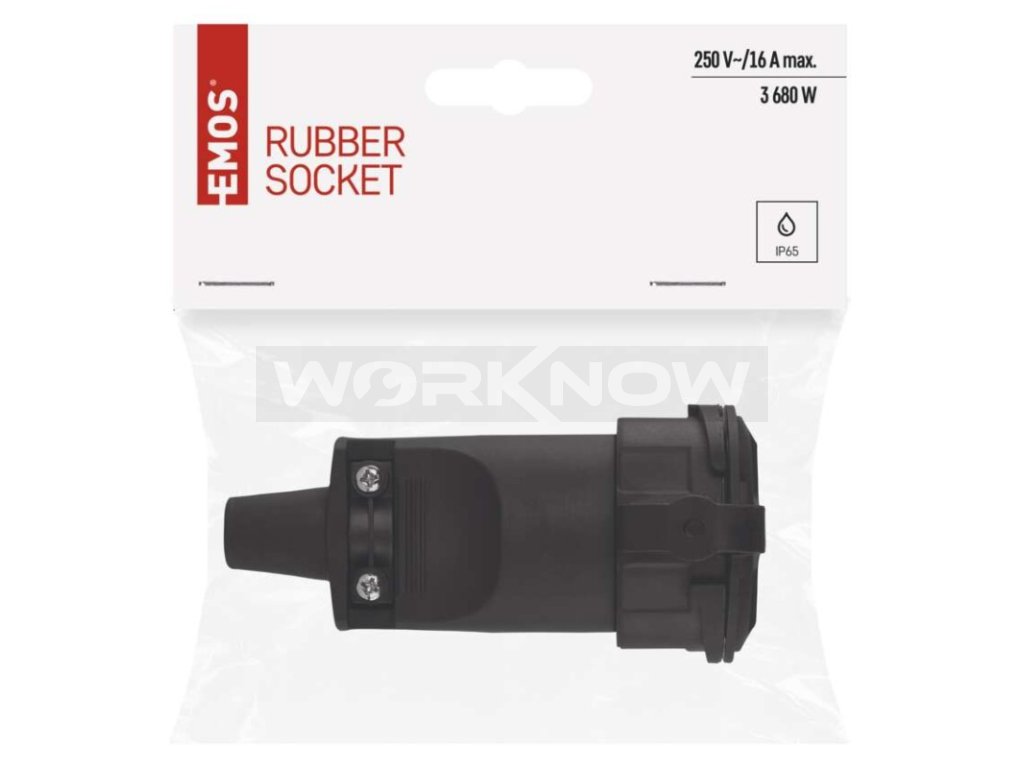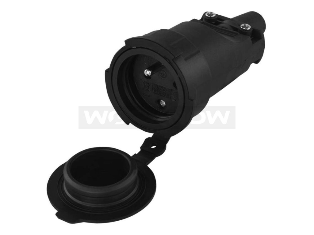 Gumová zásuvka pro pohyblivý prodlužovací přívod. Je určena k připojení elektrických zařízení kde je vyžadován vyšší stupeň krytí (i v exteriéru).