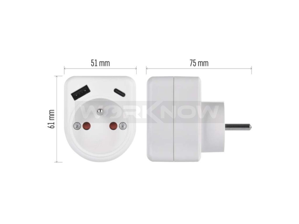 produkt: rozbočovací zásuvka 1× + 1× USB-A 5 V DC/2,4 A/ 12 W + 1× USB-C 5 V DC/ 3 A/ 15 W, Total A+C: 3 A/ 15 W max.
