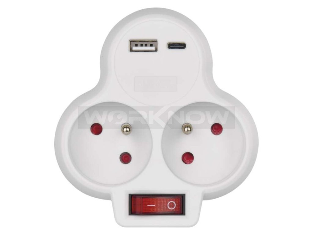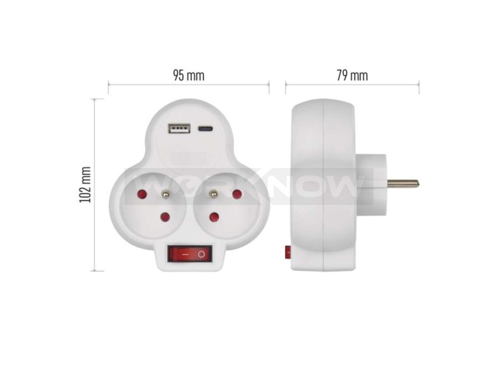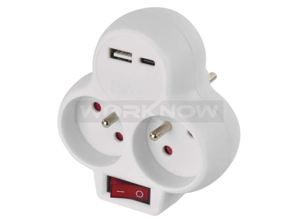 Adaptor dvojnásobný rozbočovací s vypínačem a USB výstupem A+C. Max. ∑16 A. 2× USB ∑3,4 A max (17W).