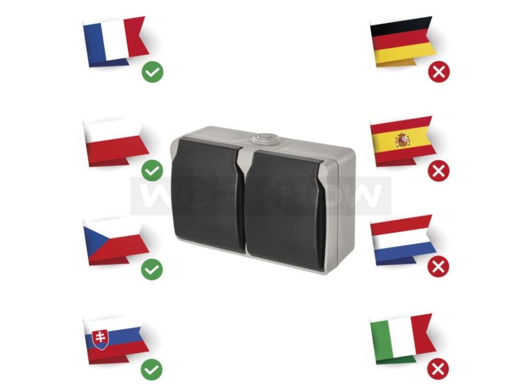 Kvalitní nástěnná voděodolná FRENCH dvojzásuvka s ochraným víčkem.