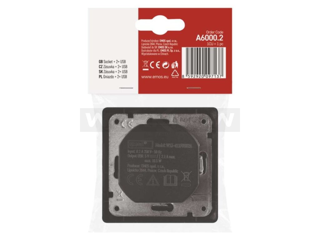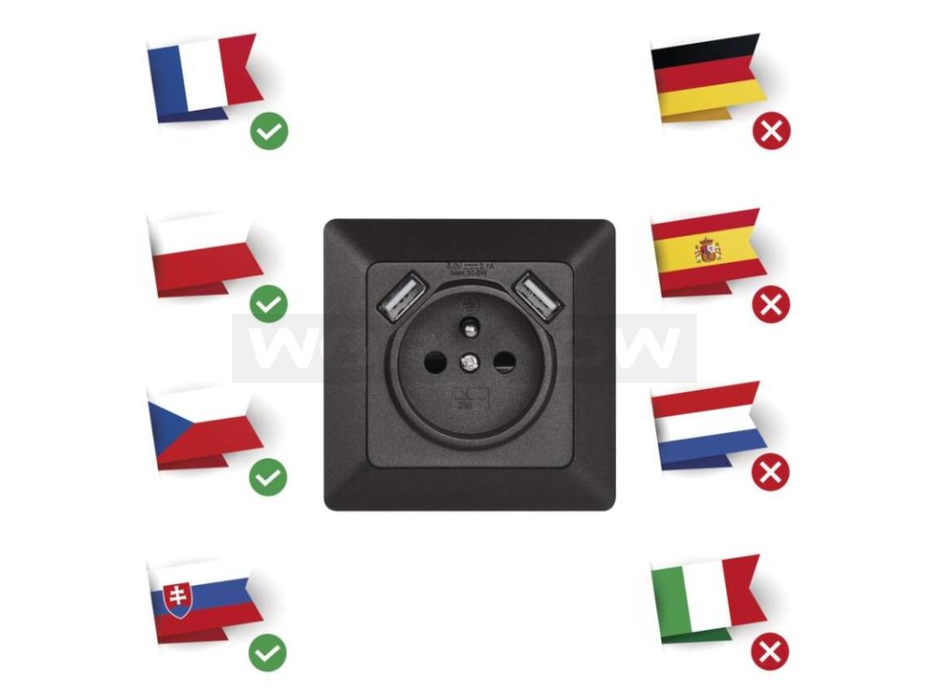 | Produkt: | zásuvka jednonásobná s ochranným kolíkem a USB výstupem 2,1 A max. |
